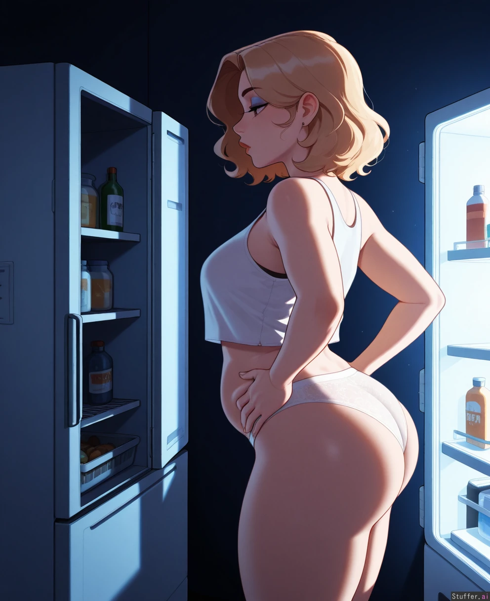 (pudgeruffian(artist)), (nyantcha(artist)), solo, 1girl, masterpiece, best quality, best anatomy, cool colors, (open fridge, fridge light), (dark room), kitchen, standing straight, (side view), nighttime, looking forward, hands on hips, profile, (Blonde hair, curtained hair, melina hair, medium hair), ((eyes half closed)), eyeshadow, (luscious big lips), mature, black eyes, horny, hungry, Thin, belly, ((hyper obese, way too fat, enormous round obese belly:0.0), (huge obese hips, huge fat thighs, fat arms, thick fat rolls:0.0):0.0), huge hips, big ass, thick thighs, (white lacy panties, white tank top)
