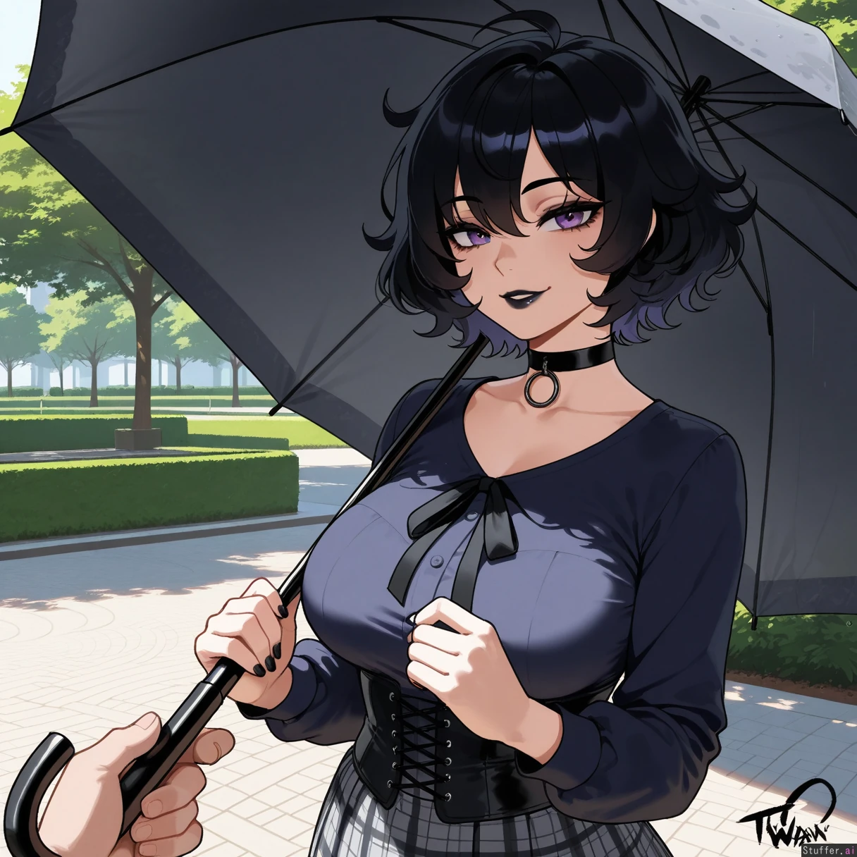 perfect anatomy, beautiful face, beautiful eyes, Masterpiece, best_quality, beautiful, vibrant colors, dim light, (1girl), alone, Tweedabop(artist), betterwithsalt(artist), nyantcha(artist), perfect hands, front view, goth girl, short hair, black hair, messy hair, purple eyes, black lipstick, black choker, black corset, grey plaid skirt, holding black umbrella, park, day, happy, ((wide hips, fat ass, gigantic thighs, overweight):0.5)