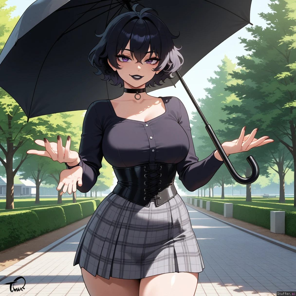 perfect anatomy, beautiful face, beautiful eyes, Masterpiece, best_quality, beautiful, vibrant colors, dim light, (1girl), alone, Tweedabop(artist), betterwithsalt(artist), nyantcha(artist), perfect hands, front view, dynmaic pose, goth girl, short hair, black hair, messy hair, purple eyes, black lipstick, black choker, black corset, grey plaid skirt, holding black umbrella, park, day, happy, ((wide hips, fat ass, gigantic thighs, overweight):0.5)