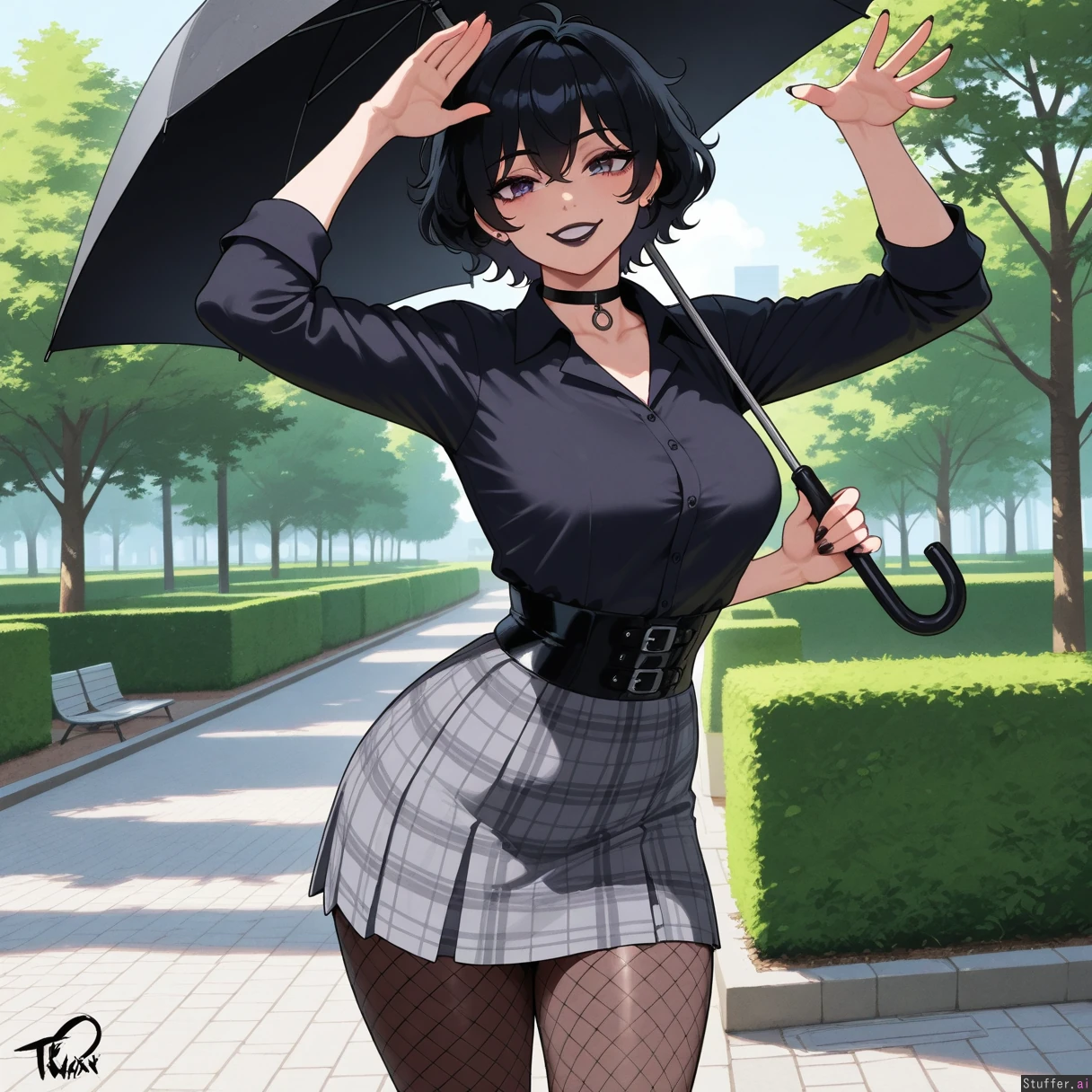 perfect anatomy, beautiful face, beautiful eyes, Masterpiece, best_quality, beautiful, vibrant colors, dim light, (1girl), alone, Tweedabop(artist), betterwithsalt(artist), nyantcha(artist), perfect hands, front view, dynmaic pose, goth girl, short hair, black hair, messy hair, purple eyes, black lipstick, black choker, black buttonup shirt, black corset, grey plaid skirt, black fishnet leggings, holding black umbrella, park, day, happy, ((wide hips, fat ass, gigantic thighs, overweight):0.5)