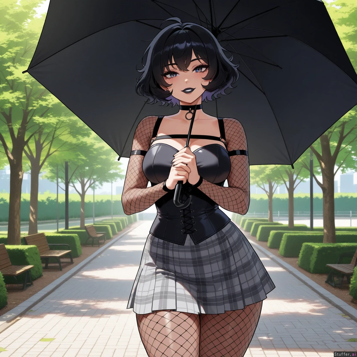 perfect anatomy, beautiful face, beautiful eyes, Masterpiece, best_quality, beautiful, vibrant colors, dim light, (1girl), alone, Tweedabop(artist), betterwithsalt(artist), nyantcha(artist), perfect hands, front view, dynmaic pose, goth girl, short hair, black hair, messy hair, purple eyes, black lipstick, black choker, fishnet sleeves, black corset, grey plaid skirt, black fishnet leggings, holding black umbrella, park, day, happy, ((wide hips, fat ass, gigantic thighs, overweight):0.5)