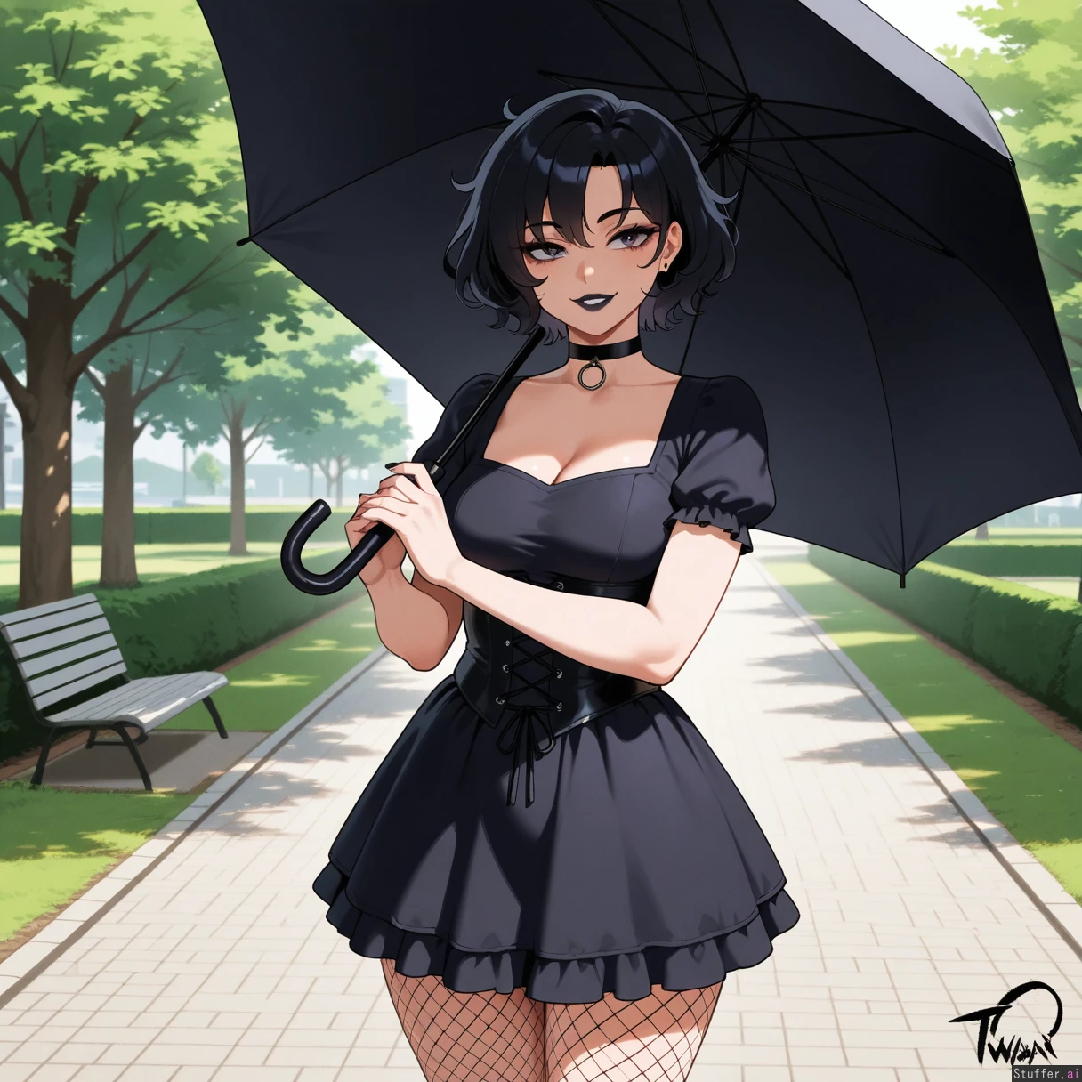 perfect anatomy, beautiful face, beautiful eyes, Masterpiece, best_quality, beautiful, vibrant colors, dim light, (1girl), alone, Tweedabop(artist), betterwithsalt(artist), nyantcha(artist), perfect hands, front view, dynmaic pose, goth girl, short hair, black hair, messy hair, purple eyes, black lipstick, black choker, black corset, black dress, fishnet leggings, holding black umbrella, park, day, happy, ((wide hips, fat ass, gigantic thighs, overweight):0.5)
