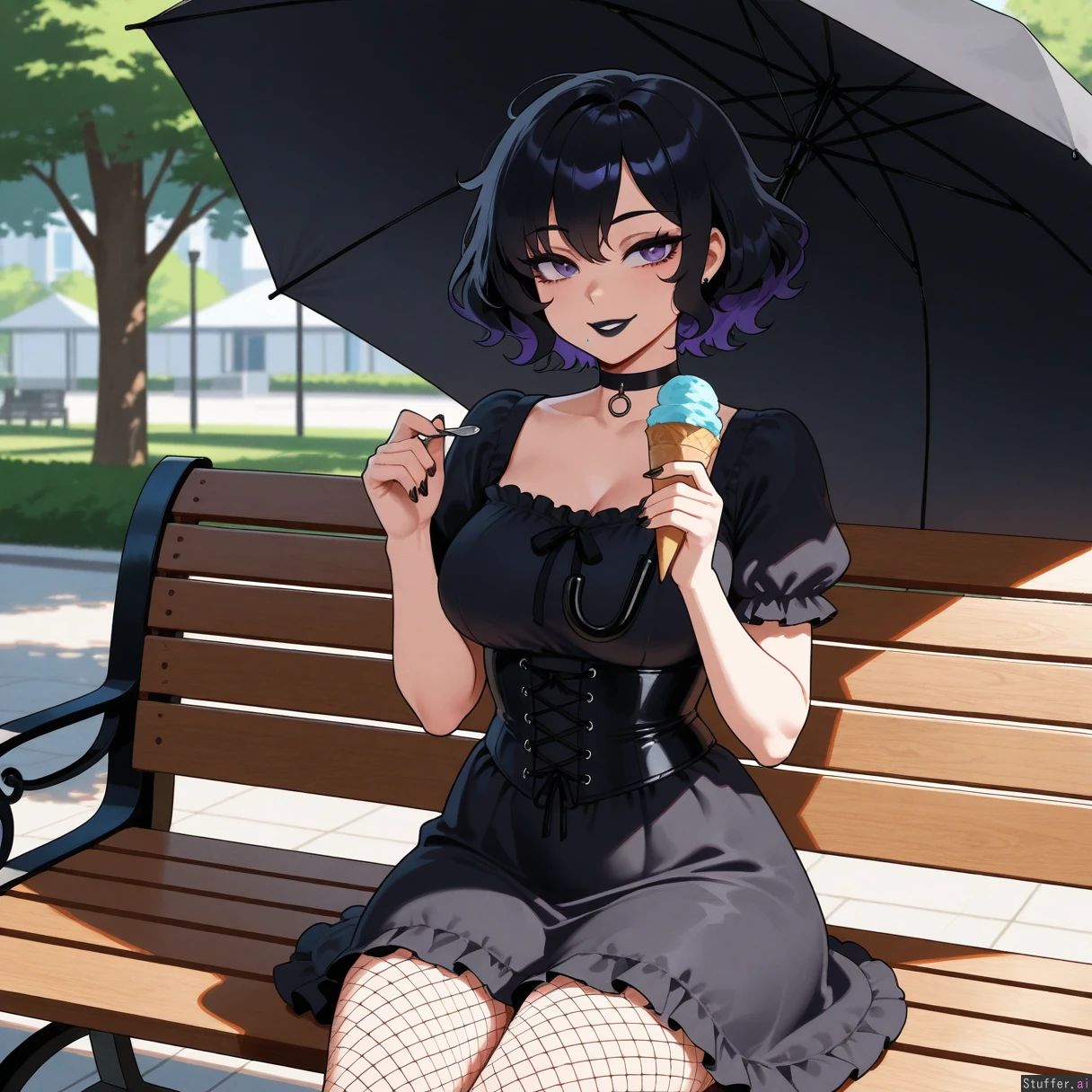 perfect anatomy, beautiful face, beautiful eyes, Masterpiece, best_quality, beautiful, vibrant colors, dim light, (1girl), alone, Tweedabop(artist), betterwithsalt(artist), nyantcha(artist), perfect hands, front view, dynmaic pose, goth girl, short hair, black hair, messy hair, purple eyes, black lipstick, black choker, black corset, black dress, fishnet leggings, black umbrella, park, day, happy, sitting on bench, eating ice cream cone, ((wide hips, fat ass, gigantic thighs, overweight):0.5)