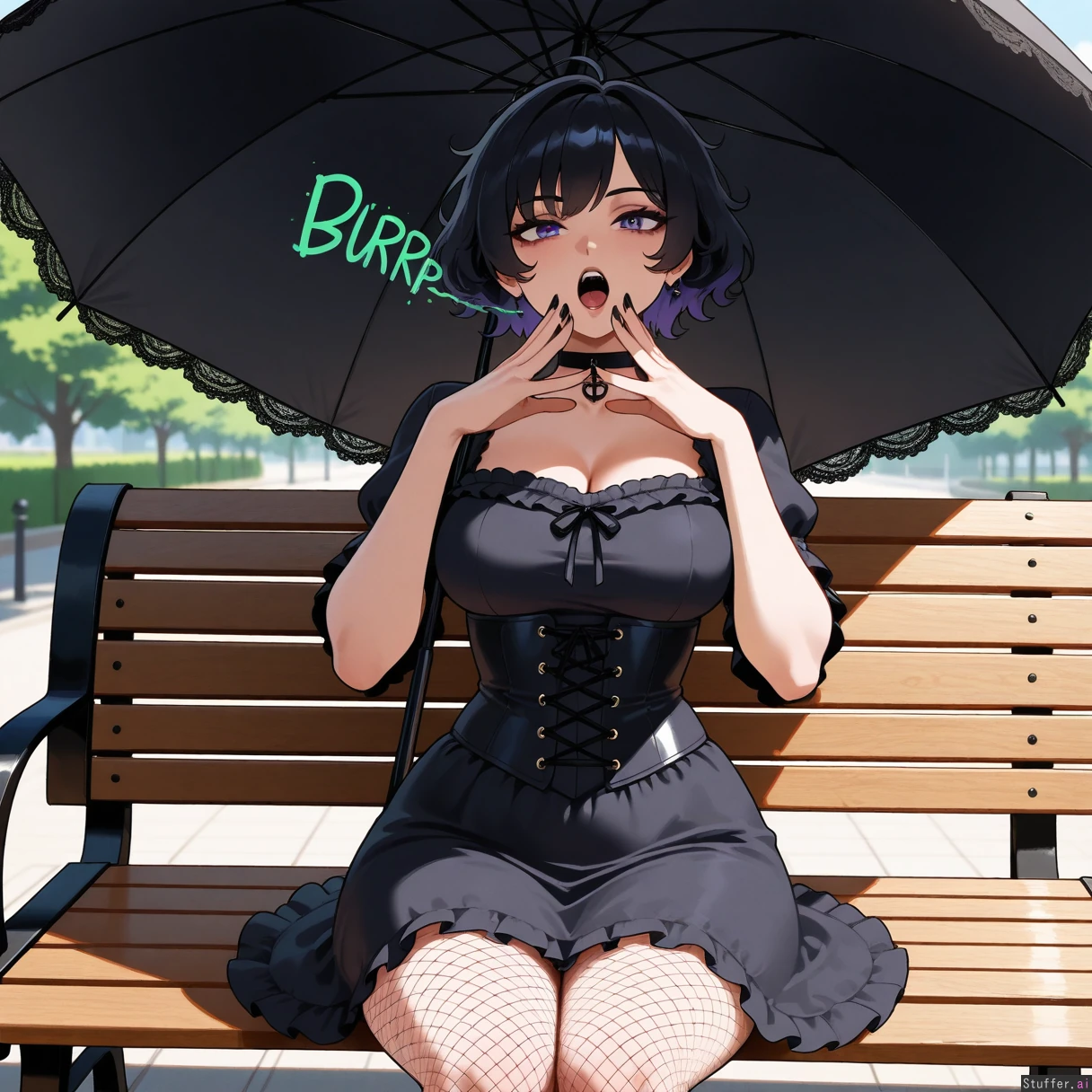 perfect anatomy, beautiful face, beautiful eyes, Masterpiece, best_quality, beautiful, vibrant colors, dim light, (1girl), alone, Tweedabop(artist), betterwithsalt(artist), nyantcha(artist), perfect hands, front view, dynmaic pose, goth girl, short hair, black hair, messy hair, purple eyes, black lipstick, black choker, black corset, black dress, fishnet leggings, black umbrella, park, day, sitting on bench, opened corset, ((burping)), ((wide hips, fat ass, gigantic thighs, overweight):0.5)