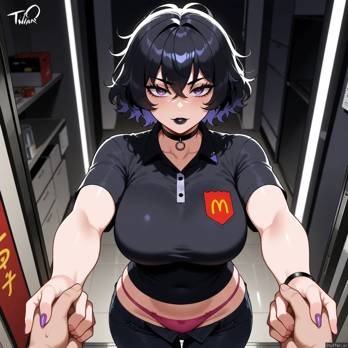 perfect anatomy, beautiful face, beautiful eyes, Masterpiece, best_quality, beautiful, vibrant colors, dim light, (1girl), alone, Tweedabop(artist), betterwithsalt(artist), nyantcha(artist), perfect hands, front view, dynmaic pose, goth girl, short hair, black hair, messy hair, purple eyes, black lipstick, black choker, McDonalds employee, lockerroom, pulling down black jeans, pink panties, sighing, ((wide hips, fat ass, gigantic thighs, overweight):0.5)