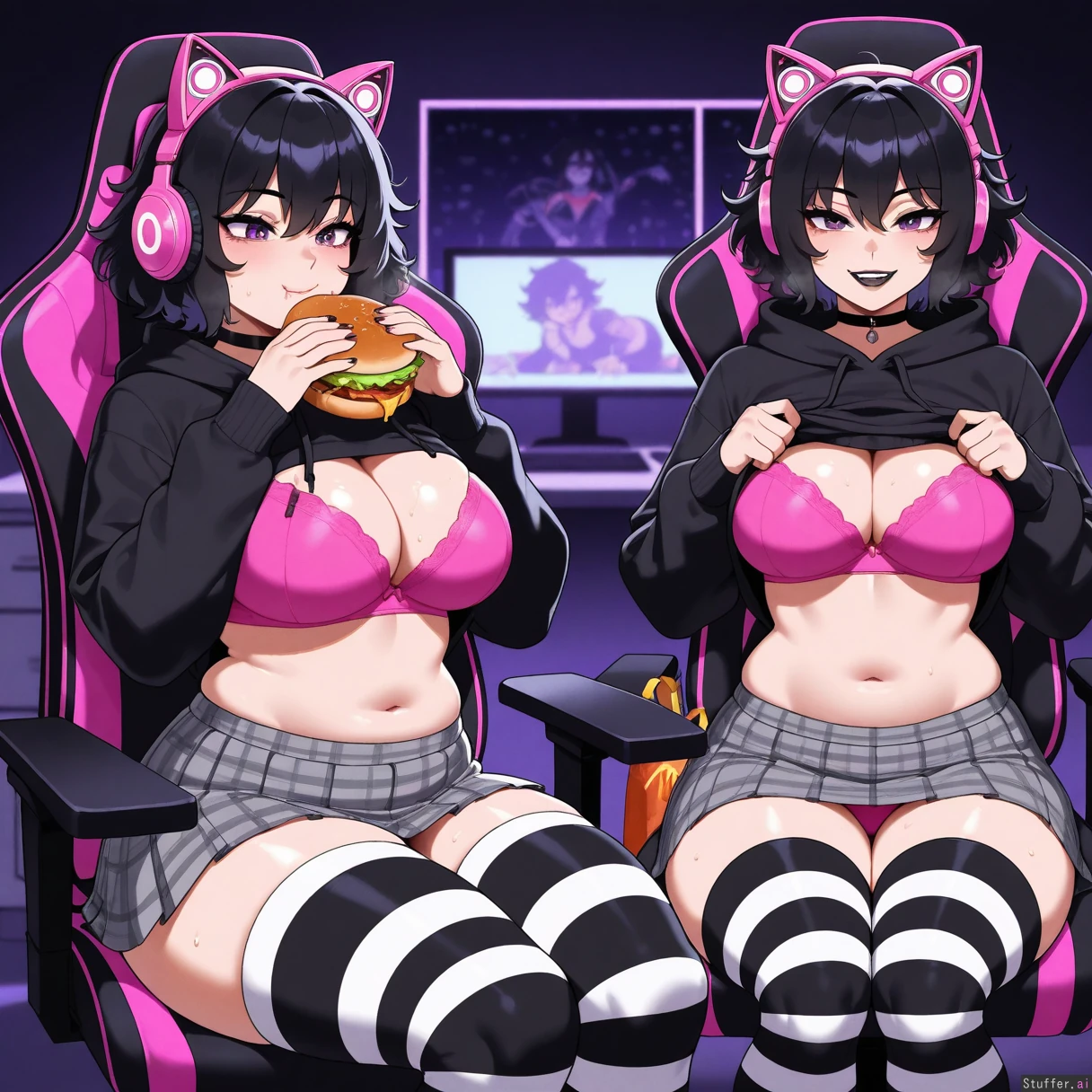 perfect anatomy, beautiful face, beautiful eyes, Masterpiece, best_quality, beautiful, vibrant colors, dim light, (1girl), alone, Tweedabop(artist), betterwithsalt(artist), nyantcha(artist), perfect hands, front view, dynmaic pose, goth girl, short hair, black hair, messy hair, purple eyes, black lipstick, black choker, black hoodie jacket croptop, midriff, grey plaid skirt, pink catgirl headphones, white and black striped thigh highs, pink bra, sitting in gaming chair, eating burger, happy, McDonalds bag, panting, sweating, out of breath, undressing, pink panties, overflowing belly, bedroom, ((wide hips, fat ass, gigantic thighs, overweight):0.6)