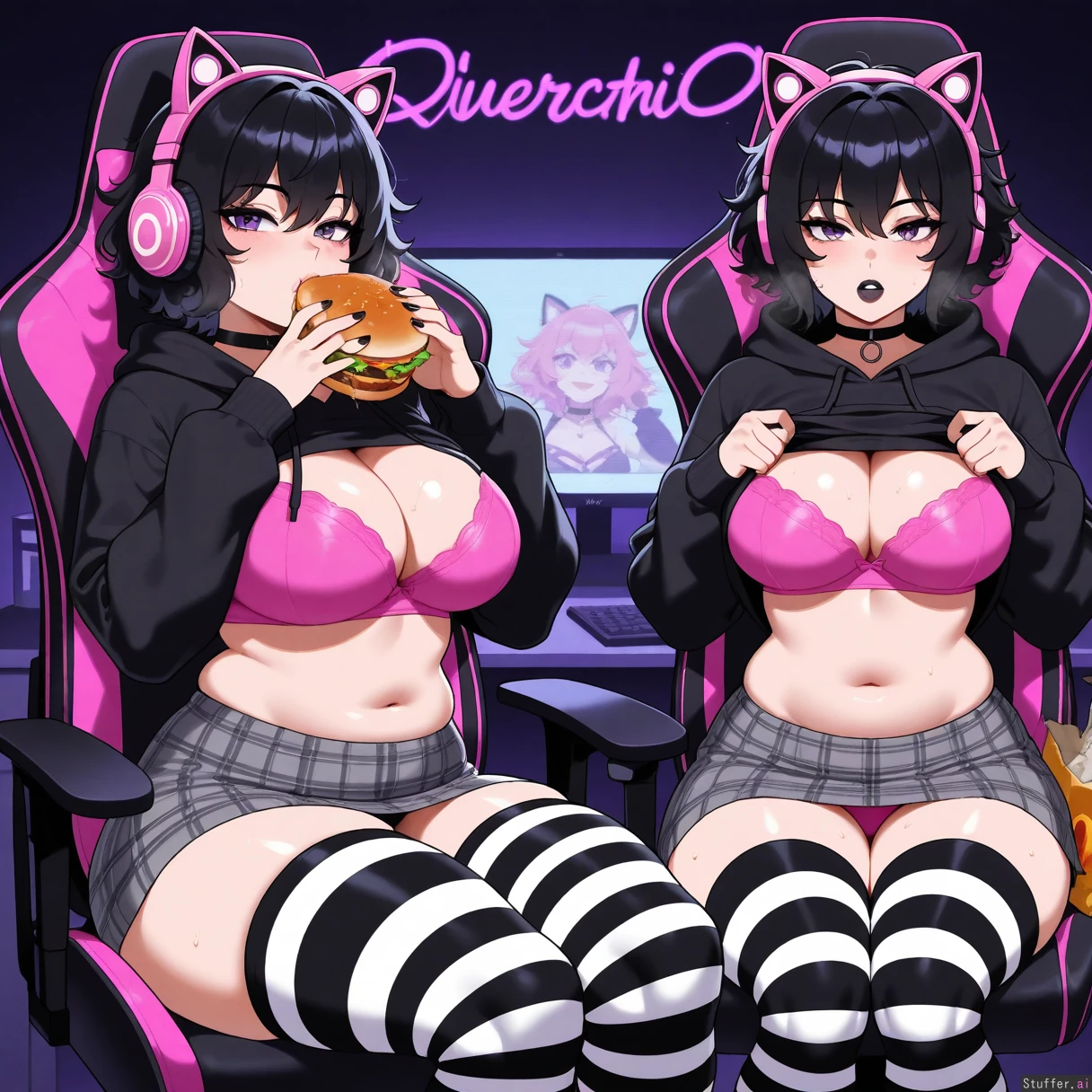 perfect anatomy, beautiful face, beautiful eyes, Masterpiece, best_quality, beautiful, vibrant colors, dim light, (1girl), alone, Tweedabop(artist), betterwithsalt(artist), nyantcha(artist), perfect hands, front view, dynmaic pose, goth girl, short hair, black hair, messy hair, purple eyes, black lipstick, black choker, black hoodie jacket croptop, midriff, grey plaid skirt, pink catgirl headphones, white and black striped thigh highs, pink bra, sitting in gaming chair, eating burger, McDonalds bag, panting, sweating, out of breath, undressing, pink panties, overflowing belly, bedroom, ((wide hips, fat ass, gigantic thighs, overweight):0.6)