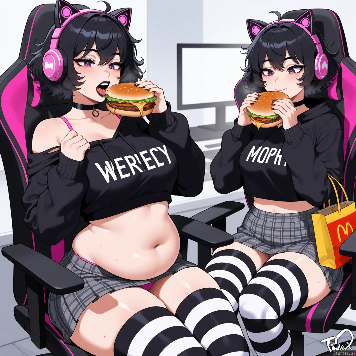 perfect anatomy, beautiful face, beautiful eyes, Masterpiece, best_quality, beautiful, vibrant colors, dim light, (1girl), alone, Tweedabop(artist), betterwithsalt(artist), nyantcha(artist), perfect hands, front view, dynmaic pose, goth girl, short hair, black hair, messy hair, purple eyes, black lipstick, black choker, black hoodie jacket croptop, midriff, grey plaid skirt, pink catgirl headphones, white and black striped thigh highs, pink bra strap, sitting in gaming chair, eating burger, happy, McDonalds bag, sweating, panting, out of breath, undressing, pink panties, overflowing belly, bedroom, ((wide hips, fat ass, gigantic thighs, overweight):0.6)