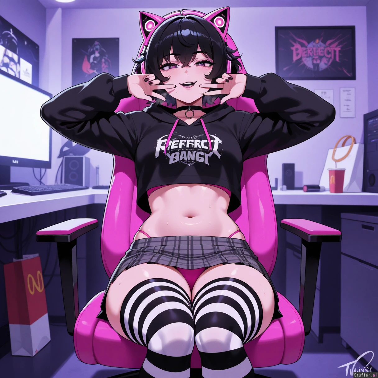 perfect anatomy, beautiful face, beautiful eyes, Masterpiece, best_quality, beautiful, vibrant colors, dim light, (1girl), alone, Tweedabop(artist), betterwithsalt(artist), nyantcha(artist), perfect hands, front view, dynmaic pose, goth girl, short hair, black hair, messy hair, purple eyes, black lipstick, black choker, black hoodie jacket croptop, midriff, grey plaid skirt, pink catgirl headphones, white and black striped thigh highs, pink bra strap, sitting in gaming chair, eating burger, happy, McDonalds bag, sweating, panting, out of breath, undressing, pulling down skirt, pink panties, overflowing belly, bedroom, ((wide hips, fat ass, gigantic thighs, overweight):0.6)
