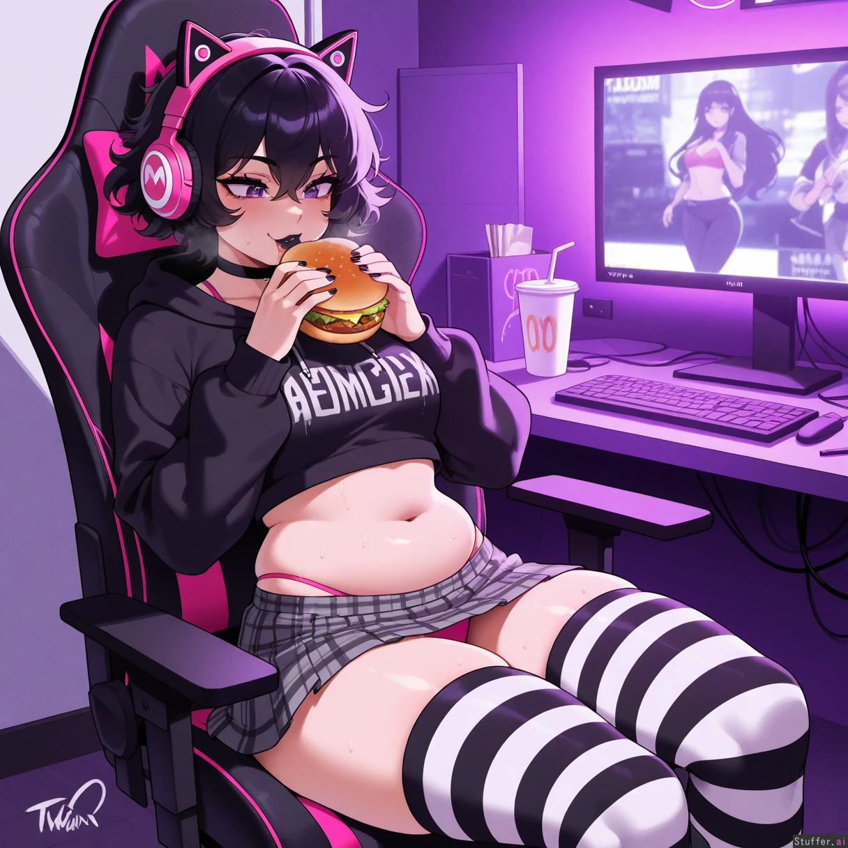 perfect anatomy, beautiful face, beautiful eyes, Masterpiece, best_quality, beautiful, vibrant colors, dim light, (1girl), alone, Tweedabop(artist), betterwithsalt(artist), nyantcha(artist), perfect hands, front view, dynmaic pose, goth girl, short hair, black hair, messy hair, purple eyes, black lipstick, black choker, black hoodie jacket croptop, midriff, grey plaid skirt, pink catgirl headphones, white and black striped thigh highs, pink bra strap, sitting in gaming chair, eating burger, happy, McDonalds bag, sweating, panting, out of breath, undressing, pulling down skirt, pink panties, overflowing belly, bedroom, ((wide hips, fat ass, gigantic thighs, overweight):0.6)