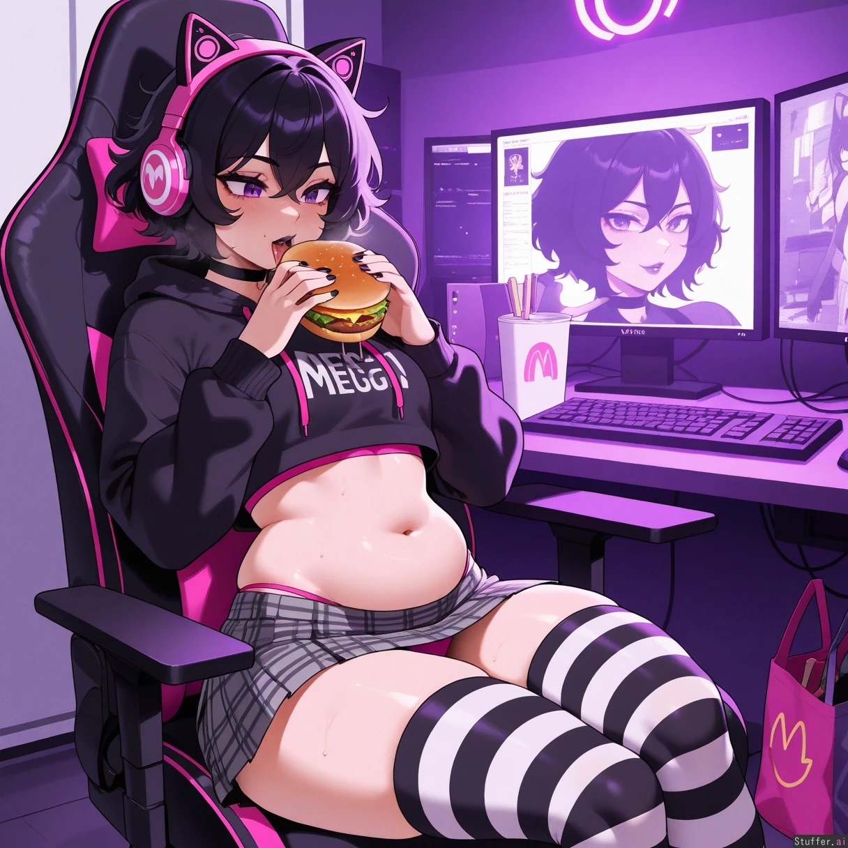 perfect anatomy, beautiful face, beautiful eyes, Masterpiece, best_quality, beautiful, vibrant colors, dim light, (1girl), alone, Tweedabop(artist), betterwithsalt(artist), nyantcha(artist), perfect hands, front view, dynmaic pose, goth girl, short hair, black hair, messy hair, purple eyes, black lipstick, black choker, black hoodie jacket croptop, midriff, grey plaid skirt, pink catgirl headphones, white and black striped thigh highs, pink bra, sitting in gaming chair, eating burger, happy, McDonalds bag, sweating, panting, out of breath, undressing, pulling up hoodie, pink panties, overflowing belly, bedroom, ((wide hips, fat ass, gigantic thighs, overweight):0.6)