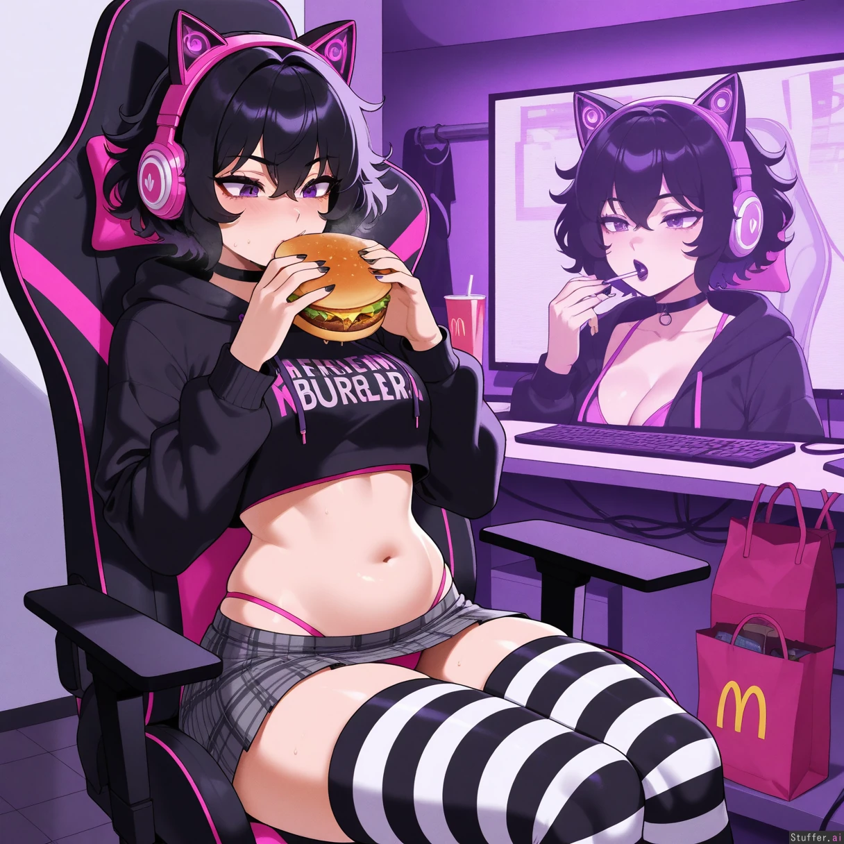 perfect anatomy, beautiful face, beautiful eyes, Masterpiece, best_quality, beautiful, vibrant colors, dim light, (1girl), alone, Tweedabop(artist), betterwithsalt(artist), nyantcha(artist), perfect hands, front view, dynmaic pose, goth girl, short hair, black hair, messy hair, purple eyes, black lipstick, black choker, black hoodie jacket croptop, midriff, grey plaid skirt, pink catgirl headphones, white and black striped thigh highs, pink bra, sitting in gaming chair, eating burger, McDonalds bag, sweating, panting, out of breath, undressing, pulling up hoodie, pink panties, overflowing belly, bedroom, ((wide hips, fat ass, gigantic thighs, overweight):0.6)