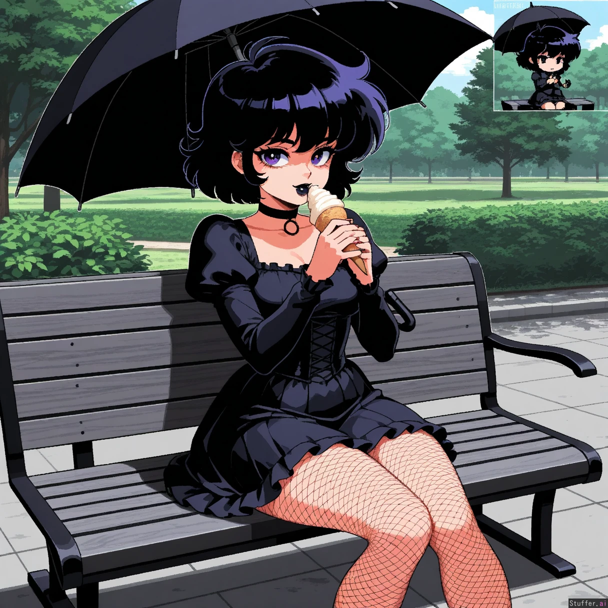 perfect anatomy, beautiful face, beautiful eyes, Masterpiece, best_quality, beautiful, vibrant colors, dim light, (1girl), alone, Tweedabop(artist), betterwithsalt(artist), nyantcha(artist), (((Pixel art style, retro, pixelated, pixel shading))), ((Adventure game, 80s retro, limited color palette)), perfect hands, front view, dynmaic pose, goth girl, short hair, black hair, messy hair, purple eyes, black lipstick, black choker, black corset, black dress, fishnet leggings, holding black umbrella, park, day, happy, sitting on bench, eating ice cream cone, ((wide hips, fat ass, gigantic thighs, overweight):0.5)