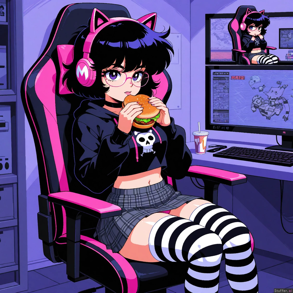 perfect anatomy, beautiful face, beautiful eyes, Masterpiece, best_quality, beautiful, vibrant colors, dim light, (1girl), alone, Tweedabop(artist), betterwithsalt(artist), nyantcha(artist), (((Pixel art style, retro, pixelated, pixel shading))), ((Adventure game, 80s retro, limited color palette)), perfect hands, front view, dynmaic pose, goth girl, short hair, black hair, messy hair, purple eyes, black lipstick, black choker, glasses, pink catgirl headphones, white and black striped thigh highs, sitting in gaming chair, pink panties, bedroom, black hoodie jacket croptop, midriff, grey plaid skirt, pink bra strap, McDonalds bag, eating burger, ((wide hips, fat ass, gigantic thighs, overweight):0.5)