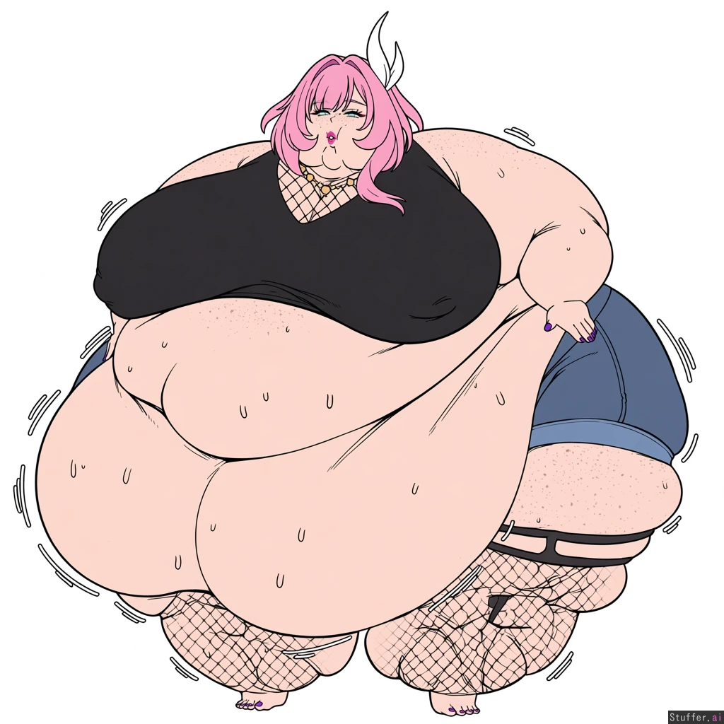 solo, usa3710692(artist), KAMII MOMORU(artist), kobayasikobako(artist), thick lines, High quality, (Masterpiece), (semi-realistic human anatomy), (perfect anatomy), (perfect hands), (flat colors:1.3), 1girl, Cyrene, honkai star rail, ((Beautiful adult female)), (dense freckles), (detailed eyes, detailed face), Black sport top, jean shorts, fishnet, black chocker, barefoot, purple nails, ((Extremely fat, vastly morbidly obese, weight gain, hyper expansion:1.4)), (sagging breasts),(gigantic belly), ((Gigantic Fat wide hips:1.4)), ((gigantic thick thighs:1.4)), ((Gigantic fat ass:1.4)), ((packed with fat)), ((Fat arms)),((Love handles)), (soft lips, pink lips), (obese lower belly, belly), ((obese FUPA)), sweating, sweating a lot, hands on side, ((embarrased)), ((Weight Conscious)), open eyes, horny, open mouth, huffing, erect nipples, cellulite, (fat neck, fat face, double_chin:1.4),