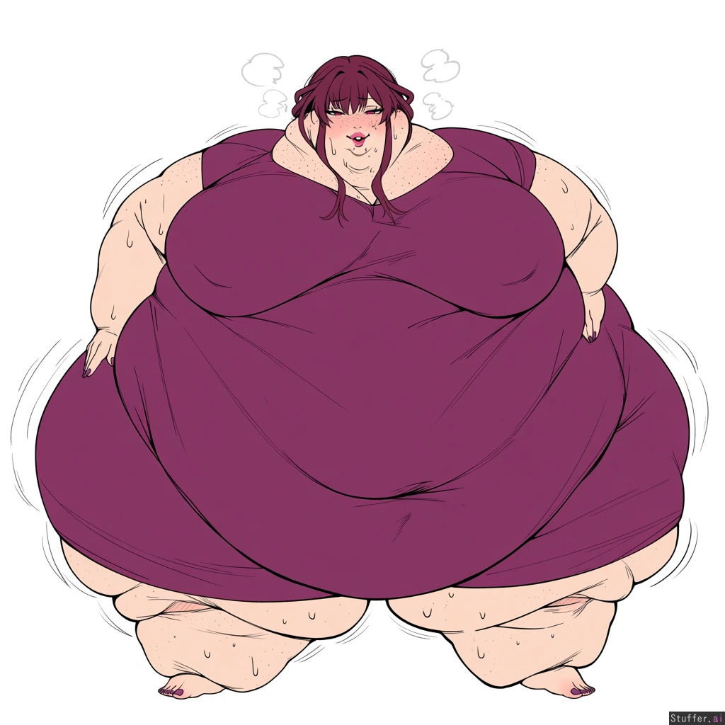 solo, usa3710692(artist), KAMII MOMORU(artist), kobayasikobako(artist), thick lines, High quality, (Masterpiece), (semi-realistic human anatomy), (perfect anatomy), (perfect hands), (flat colors:1.3), 1girl, Kafka, honkai star rail, ((Beautiful adult female)), (dense freckles), (detailed eyes, detailed face), Magenta dress, barefoot, purple nails, ((Extremely fat, vastly morbidly obese, weight gain, hyper expansion:1.4)), (sagging breasts),(gigantic belly), ((Gigantic Fat wide hips:1.4)), ((gigantic thick thighs:1.4)), ((Gigantic fat ass:1.4)), ((packed with fat)), ((Fat arms)),((Love handles)), (soft lips, pink lips), (obese lower belly, belly), ((obese FUPA)), sweating, sweating a lot, hands on side, ((embarrased)), ((Weight Conscious)), open eyes, horny, open mouth, huffing, erect nipples, cellulite, (fat neck, fat face, double_chin:1.4),