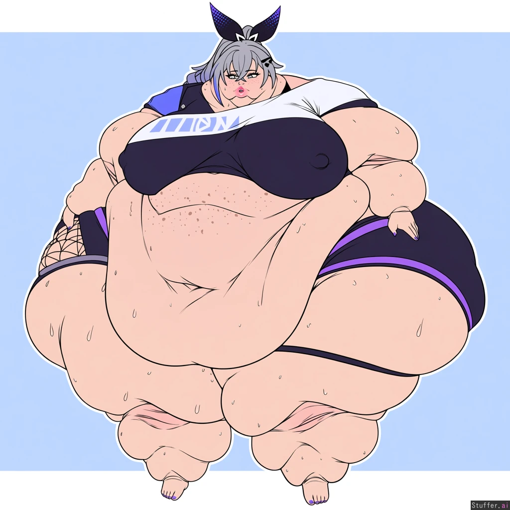 solo, usa3710692(artist), KAMII MOMORU(artist), kobayasikobako(artist), thick lines, High quality, (Masterpiece), (semi-realistic human anatomy), (perfect anatomy), (perfect hands), (flat colors:1.3), 1girl, Silver wolf, honkai star rail, ((Beautiful adult female)), (dense freckles), (detailed eyes, detailed face), original clothes, barefoot, purple nails, ((Extremely fat, vastly morbidly obese, weight gain, hyper expansion:1.4)), (sagging breasts),(gigantic belly), ((Gigantic Fat wide hips:1.4)), ((gigantic thick thighs:1.4)), ((Gigantic fat ass:1.4)), ((packed with fat)), ((Fat arms)),((Love handles)), (soft lips, pink lips), (obese lower belly, belly), ((obese FUPA)), sweating, sweating a lot, hands on side, ((embarrased)), ((Weight Conscious)), open eyes, horny, open mouth, huffing, erect nipples, cellulite, (fat neck, fat face, double_chin:1.4),