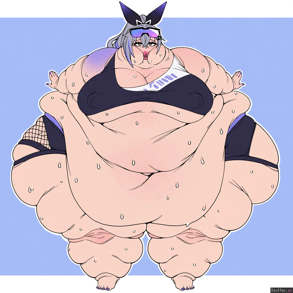 solo, usa3710692(artist), KAMII MOMORU(artist), kobayasikobako(artist), thick lines, High quality, (Masterpiece), (semi-realistic human anatomy), (perfect anatomy), (perfect hands), (flat colors:1.3), 1girl, Silver wolf, honkai star rail, ((Beautiful adult female)), (dense freckles), (detailed eyes, detailed face), original clothes, barefoot, purple nails, ((Extremely fat, vastly morbidly obese, weight gain, hyper expansion:1.4)), (sagging breasts),(gigantic belly), ((Gigantic Fat wide hips:1.4)), ((gigantic thick thighs:1.4)), ((Gigantic fat ass:1.4)), ((packed with fat)), ((Fat arms)),((Love handles)), (soft lips, pink lips), (obese lower belly, belly), ((obese FUPA)), sweating, sweating a lot, hands on side, ((embarrased)), ((Weight Conscious)), open eyes, horny, open mouth, huffing, erect nipples, cellulite, (fat neck, fat face, double_chin:1.4), Surrounded by food,