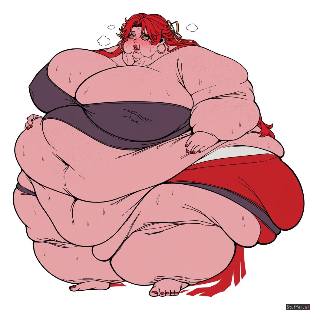 solo, usa3710692(artist), KAMII MOMORU(artist), kobayasikobako(artist), thick lines, High quality, (Masterpiece), (semi-realistic human anatomy), (perfect anatomy), (perfect hands), (flat colors:1.3), 1girl, Chisa, wuthering waves, ((Beautiful adult female)), (dense freckles), (detailed eyes, detailed face), original clothes, barefoot, red nails ((Extremely fat, vastly morbidly obese, weight gain, hyper expansion:1.4)), (sagging breasts),(gigantic belly), ((Gigantic Fat wide hips:1.4)), ((gigantic thick thighs:1.4)), ((Gigantic fat ass:1.4)), ((packed with fat)), ((Fat arms)),((Love handles)), (soft lips, pink lips), (obese lower belly, belly), ((obese FUPA)), sweating, sweating a lot, hands on side, ((embarrased)), ((Weight Conscious)), open eyes, horny, open mouth, huffing, erect nipples, cellulite, (fat neck, fat face, double_chin:1.4), Surrounded by food,