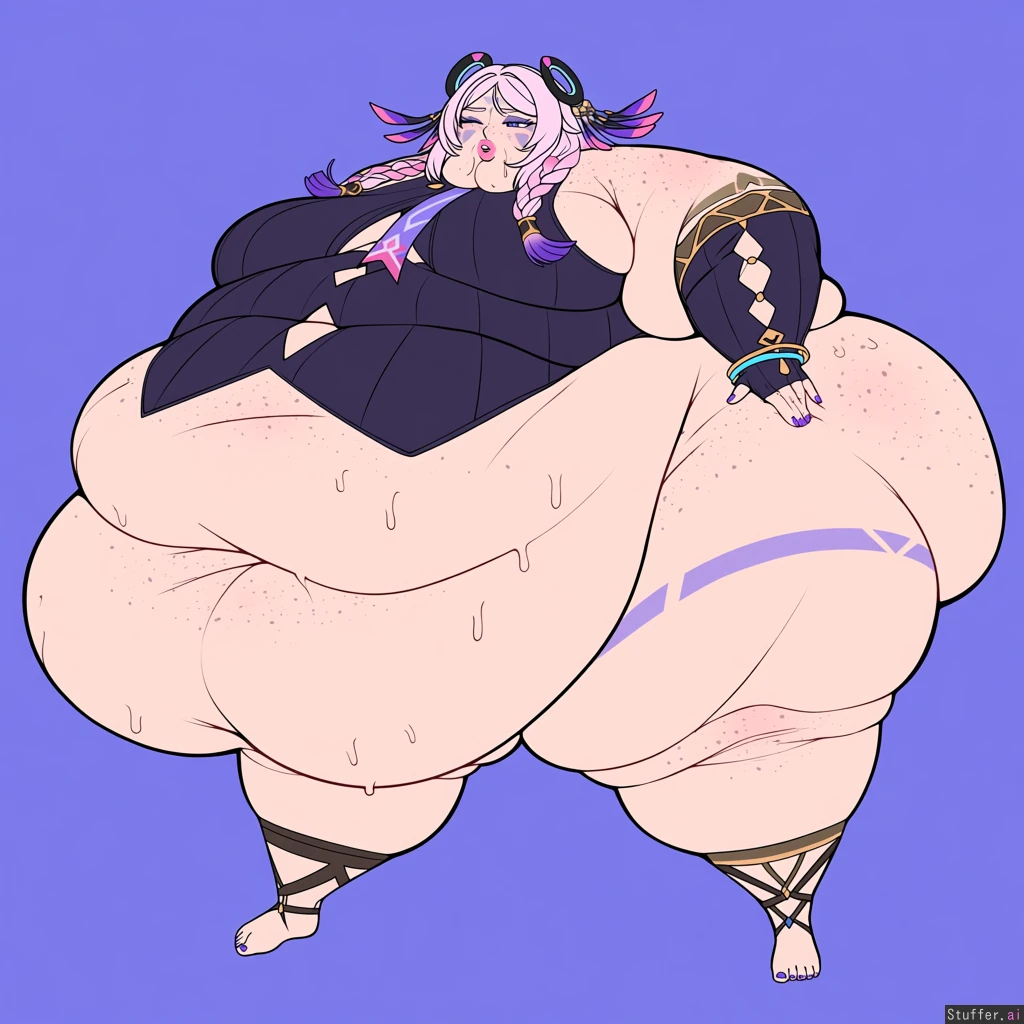 solo, usa3710692(artist), KAMII MOMORU(artist), kobayasikobako(artist), thick lines, High quality, (Masterpiece), (semi-realistic human anatomy), (perfect anatomy), (perfect hands), (flat colors:1.3), 1girl, Citlali, genshin impact, ((Beautiful adult female)), (dense freckles), (detailed eyes, detailed face), original clothes, barefoot, purple nails ((Extremely fat, vastly morbidly obese, weight gain, hyper expansion:1.4)), (sagging breasts),(gigantic belly), ((Gigantic Fat wide hips:1.4)), ((gigantic thick thighs:1.4)), ((Gigantic fat ass:1.4)), ((packed with fat)), ((Fat arms)),((Love handles)), (soft lips, pink lips), (obese lower belly, belly), ((obese FUPA)), sweating, sweating a lot, hands on side, ((embarrased)), ((Weight Conscious)), open eyes, horny, open mouth, huffing, erect nipples, cellulite, (fat neck, fat face, double_chin:1.4), Surrounded by food,