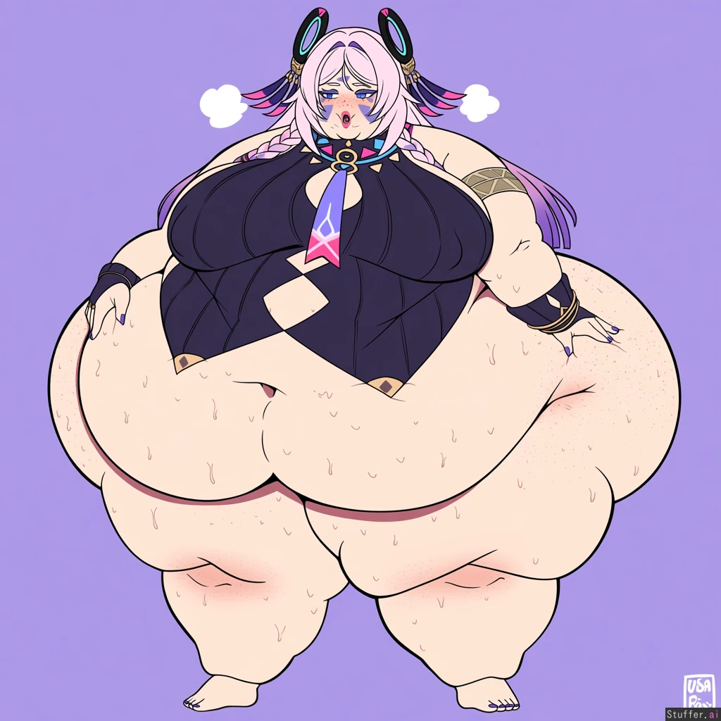 solo, usa3710692(artist), KAMII MOMORU(artist), kobayasikobako(artist), thick lines, High quality, (Masterpiece), (semi-realistic human anatomy), (perfect anatomy), (perfect hands), (flat colors:1.3), 1girl, Citlali, genshin impact, ((Beautiful adult female)), (dense freckles), (detailed eyes, detailed face), original clothes, barefoot, purple nails ((Extremely fat, vastly morbidly obese, weight gain, hyper expansion:1.4)), (sagging breasts),(gigantic belly), ((Gigantic Fat wide hips:1.4)), ((gigantic thick thighs:1.4)), ((Gigantic fat ass:1.4)), ((packed with fat)), ((Fat arms)),((Love handles)), (soft lips, pink lips), (obese lower belly, belly), ((obese FUPA)), sweating, sweating a lot, hands on side, ((embarrased)), ((Weight Conscious)), open eyes, horny, open mouth, huffing, erect nipples, cellulite, (fat neck, fat face, double_chin:1.4), Surrounded by food,