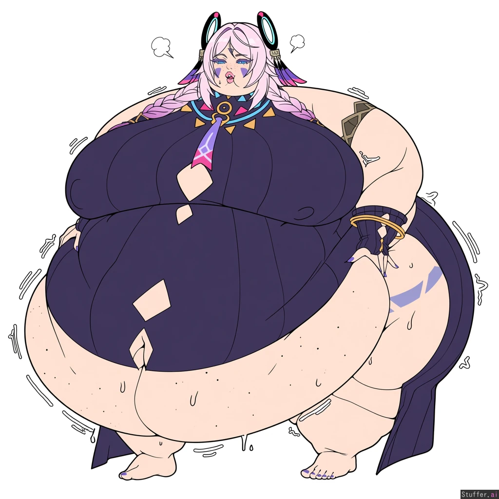 solo, usa3710692(artist), KAMII MOMORU(artist), kobayasikobako(artist), thick lines, High quality, (Masterpiece), (semi-realistic human anatomy), (perfect anatomy), (perfect hands), (flat colors:1.3), 1girl, citlali, genshin impact ((Beautiful adult female)), (dense freckles), (detailed eyes, detailed face), original clothes, barefoot, purple nails, ((Extremely fat, vastly morbidly obese, weight gain, hyper expansion:1.4)), (sagging breasts),(gigantic belly), ((Gigantic Fat wide hips:1.4)), ((gigantic thick thighs:1.4)), ((Gigantic fat ass:1.4)), ((packed with fat)), ((Fat arms)),((Love handles)), (soft lips, pink lips), (obese lower belly, belly), ((obese FUPA)), sweating, hands on side ((embarrased)), ((Weight Conscious)), open eyes, horny, open mouth, huffing, erect nipples, cellulite, (fat neck, fat face, double_chin:1.4), surrounded by food,