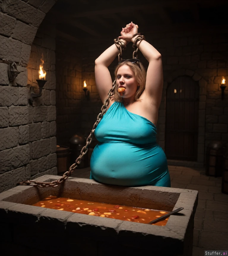 beautiful Clothed hyper obese ssbbw blob, arms tied overhead with heavy chains in medieval dungeon, she is eating from a trough of food