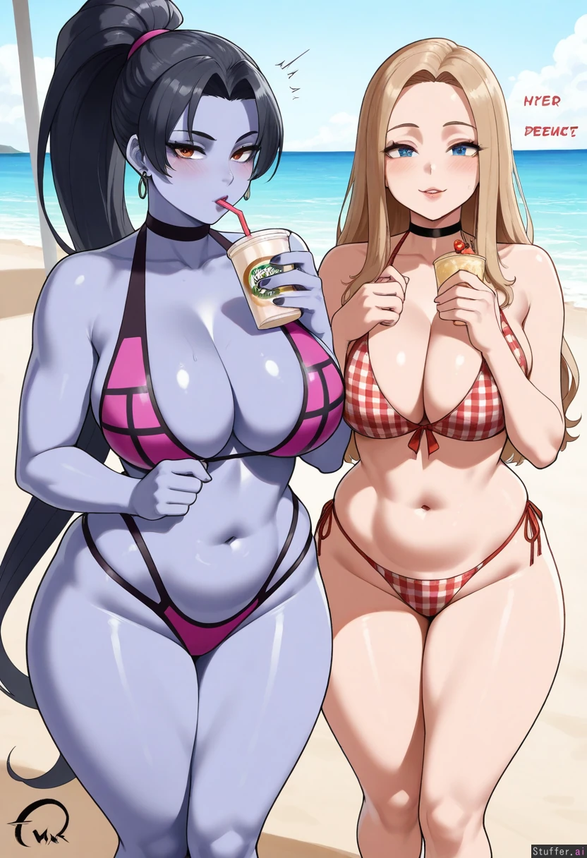 ((nyantcha)))), krekkov(artist):1.0, KAMII MOMORU(artist), c.cu(artist), araneesama(artist), (((Hyper detailed, masterpiece, flawless 10/10))) (((((Slim, toned athletic body:0.0))))) 8k, high resolution, gorgeous, masterpiece, ((flawless)), (((hyper detailed complex colors:1.6))), (((high rating))), ((highly detailed face)), beautiful face, ((((Athletic female)))), ((((she's a fat fetishist)))), ((((outside at the beach:1.5)))), ((((she's a fun-loving girl)))), (((sweaty & steamy))), ((((slim goth girl)))), (((((DVA))))), (((Widowmaker))), (((((two women standing together))))), ((Hugging)) (((snug plaid bikini top, piercings & earrings))), (((Hyper morbidly obese:1.0))) (((cute, sexy, seductive, blushing))), (((((panting))))), front view, teasing with the viewer, drinking a milkshake, surprised by the taste, chubby_belly