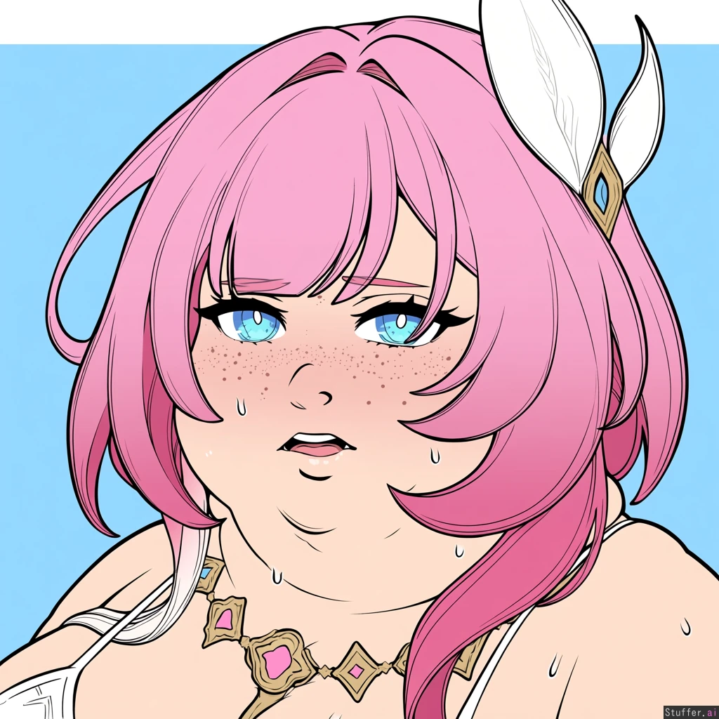solo, usa3710692(artist), KAMII MOMORU(artist), kobayasikobako(artist), thick lines, High quality, (Masterpiece), (semi-realistic human anatomy), (perfect anatomy), (perfect hands), (flat colors:1.3), 1girl, Cyrene, honkai star rail, pink hair, hair ornament, blue eyes, ((Beautiful adult female)), (dense freckles), (detailed eyes, detailed face), simple noise, anime noise, white bikini, barefoot, light blue nails, sweating, ((embarrased)), ((Weight Conscious)), open eyes, horny, slight open mouth, thicc body, face shot, (fat neck, fat face, double_chin:1.4),