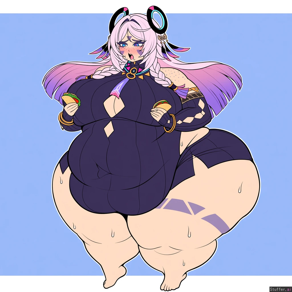 solo, usa3710692(artist), KAMII MOMORU(artist), kobayasikobako(artist), thick lines, High quality, (Masterpiece), (semi-realistic human anatomy), (perfect anatomy), (perfect hands), (flat colors:1.3), 1girl, citlali, genshin impact ((Beautiful adult female)), (dense freckles), (detailed eyes, detailed face), original clothes, barefoot, (wide hips:1.4), (thick thighs:1.4), ((Gigantic fat ass:1.4)), sweating hands on breasts, abdominal muscles, ((embarrased)), open eyes, horny, open mouth, huffing, tacos in one hand, medium body shot,