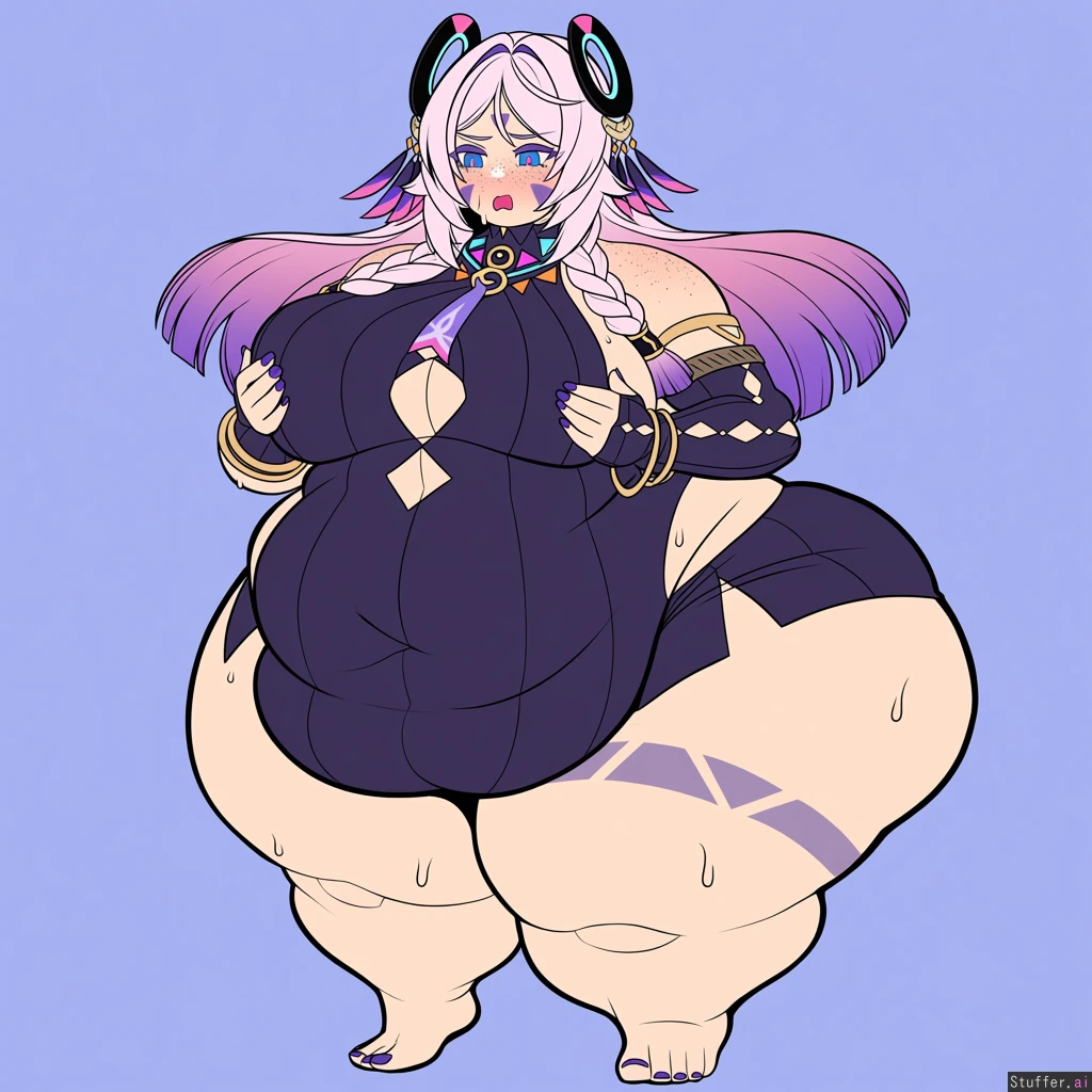 solo, usa3710692(artist), KAMII MOMORU(artist), kobayasikobako(artist), thick lines, High quality, (Masterpiece), (semi-realistic human anatomy), (perfect anatomy), (perfect hands), (flat colors:1.3), 1girl, citlali, genshin impact ((Beautiful adult female)), (dense freckles), (detailed eyes, detailed face), original clothes, barefoot, purple nails, (wide hips:1.4), (thick thighs:1.4), ((Gigantic fat ass:1.4)), sweating hands on breasts, abdominal muscles, ((embarrased)), open eyes, horny, open mouth, huffing, tacos in one hand, medium body shot,