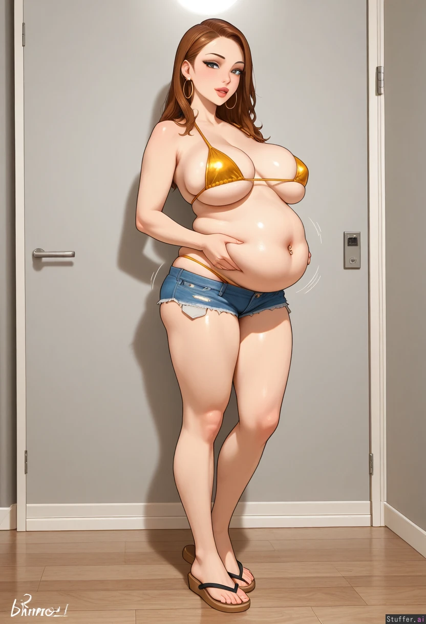1girl (( long_eyelashes mascara eyeshadow eyeliner )) brown_hair bags (( bimbo_lips big_lips:1.5)) micro_shorts denim_shorts ((( lowleg_shorts ))) panty_straps flip-flops living_room blue_eyes ((( bimbo ))) (( motion_lines )) realistic ( hoop_earrings ) navel_piercing ( belly_grab) ((overflowing_breasts)) ( potbelly:1.5) skinny standing side_profile side_view micro_bikini bikini_top