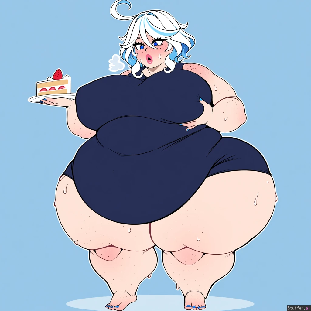 solo, usa3710692(artist), KAMII MOMORU(artist), kobayasikobako(artist), thick lines, High quality, (Masterpiece), (semi-realistic human anatomy), (perfect anatomy), (perfect hands), (flat colors:1.3), 1girl, furina, genshin impact ((Beautiful adult female)), (dense freckles), (detailed eyes, detailed face), original clothes, barefoot, blue nails, (wide hips:1.4), ((gigantic thick thighs:1.4)), (fit body:1.4), (soft lips, pink lips), sweating, hands on breasts, ((embarrased)), ((Weight Conscious)), open eyes, horny, open mouth, huffing, cake slice in one hand, medium body shot,