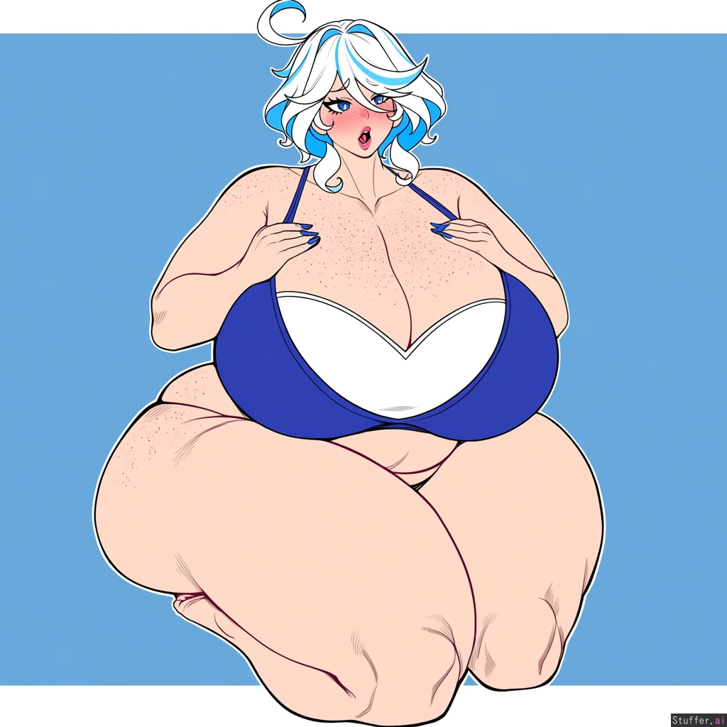 solo, usa3710692(artist), KAMII MOMORU(artist), kobayasikobako(artist), thick lines, High quality, (Masterpiece), (semi-realistic human anatomy), (perfect anatomy), (perfect hands), (flat colors:1.3), 1girl, furina, genshin impact ((Beautiful adult female)), (dense freckles), (detailed eyes, detailed face), Deep blue and white bikini, barefoot, blue nails, (wide hips:1.4), ((gigantic thick thighs:1.4)), (fit body:1.4), (soft lips, pink lips), sweating, hands on breasts, ((embarrased)), ((Weight Conscious)), open eyes, horny, open mouth, huffing, cake slice in one hand, medium body shot,