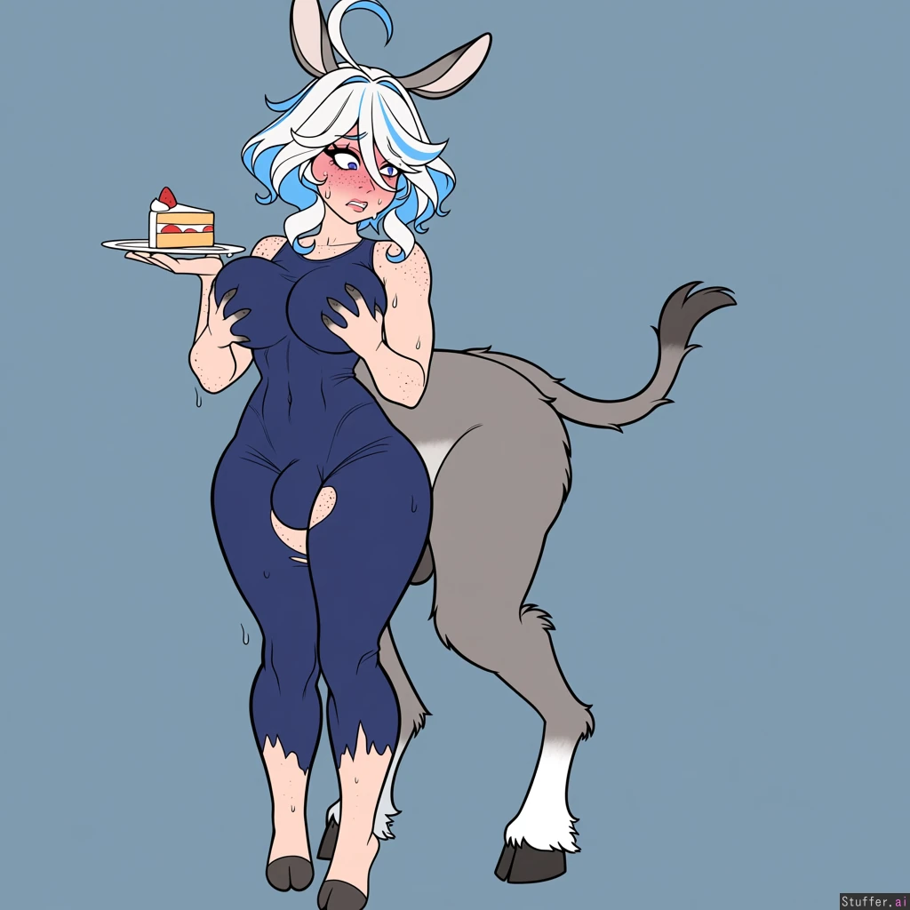 solo, usa3710692(artist), KAMII MOMORU(artist), kobayasikobako(artist), thick lines, High quality, (Masterpiece), (semi-realistic human anatomy), (perfect anatomy), (perfect hands), (flat colors:1.3), 1girl, furina, genshin impact ((Beautiful adult female)), (dense freckles), (detailed eyes, detailed face), Original clothes, barefoot, torn clothes (fit body:1.4), (soft lips, pink lips), sweating, hands on breasts, ((embarrased)), open eyes, open mouth, worried, shamed, despair, cake slice in one hand,front side full body shot, standing (Donkey transformation 1.4), gray fur, donkey nose, donkey ears, donkey feet, futanari, penis bulge,