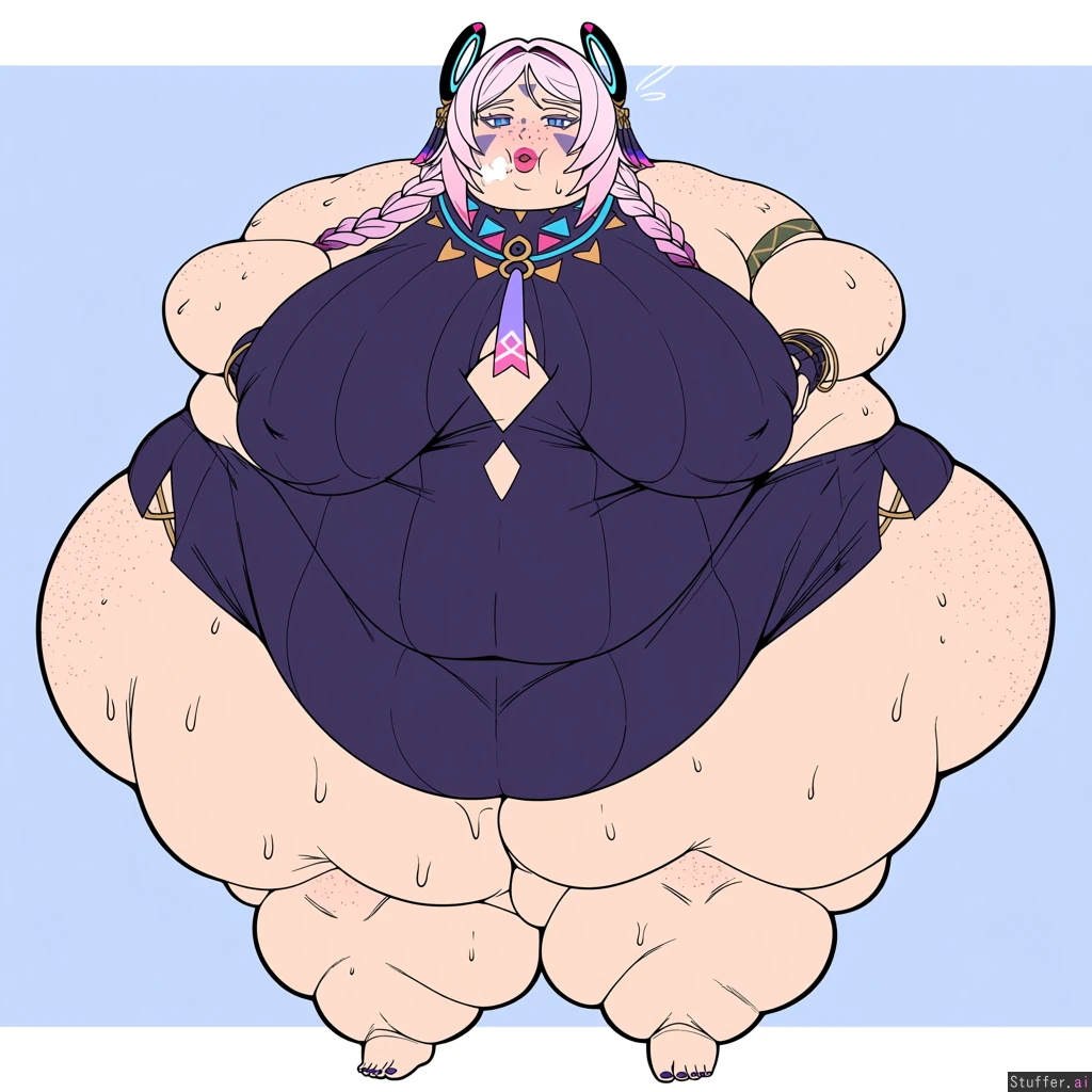 solo, usa3710692(artist), KAMII MOMORU(artist), kobayasikobako(artist), thick lines, High quality, (Masterpiece), (semi-realistic human anatomy), (perfect anatomy), (perfect hands), (flat colors:1.3), 1girl, citlali, genshin impact ((Beautiful adult female)), (dense freckles), (detailed eyes, detailed face), original clothes, barefoot, purple nails, ((Extremely fat, vastly morbidly obese, weight gain, hyper expansion:1.4)), (sagging breasts),(gigantic belly), ((Gigantic Fat wide hips:1.4)), ((gigantic thick thighs:1.4)), ((Gigantic fat ass:1.4)), ((packed with fat)), ((Fat arms)),((Love handles)), (soft lips, pink lips), (obese lower belly, belly), ((obese FUPA)), sweating, sweating a lot, hands on breasts, ((embarrased)), ((Weight Conscious)), open eyes, horny, open mouth, huffing, erect nipples, cellulite, (fat neck, fat face, double_chin:1.4), tacos in one hand, medium body shot,