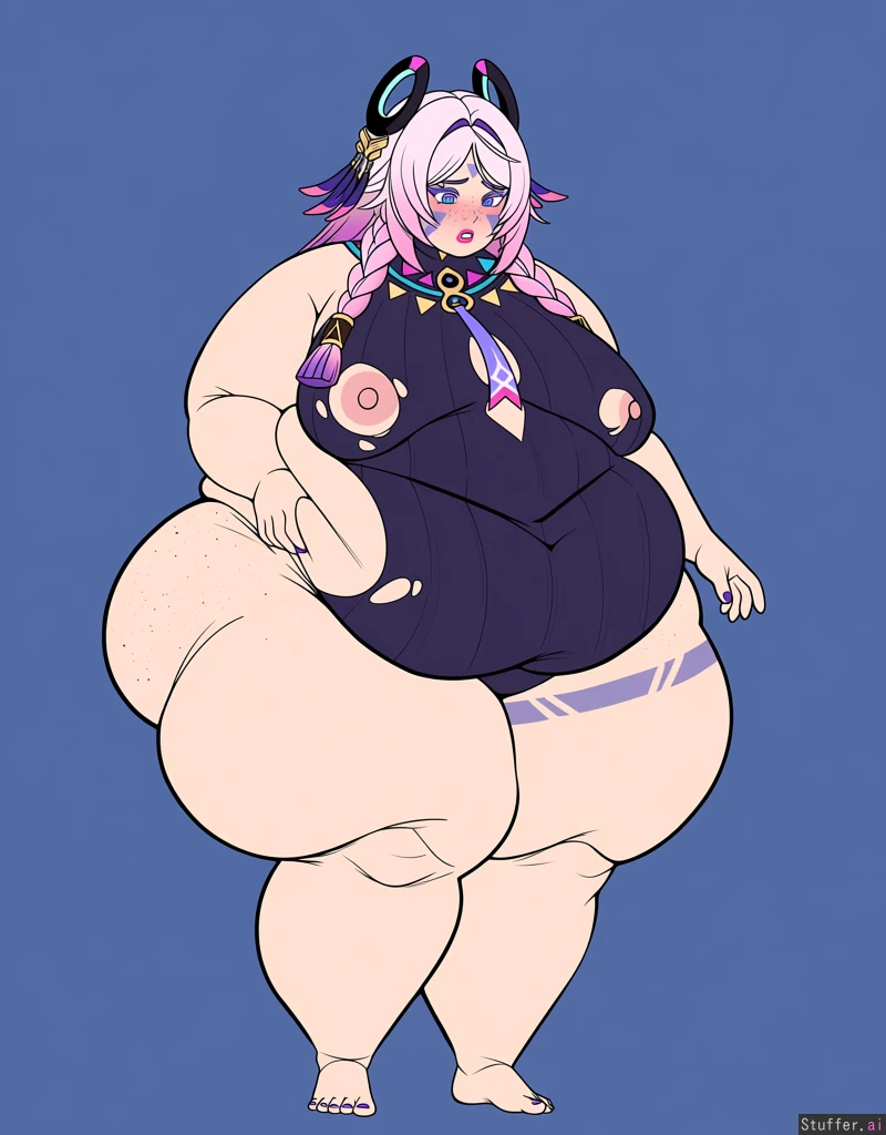 solo, usa3710692(artist), KAMII MOMORU(artist), kobayasikobako(artist), thick lines, High quality, (Masterpiece), (semi-realistic human anatomy), (perfect anatomy), (perfect hands), (flat colors:1.3), 1girl, citlali, genshin impact, pink hair, ((Beautiful adult female)), (dense freckles), (detailed eyes, detailed face), Original clothes, barefoot, (soft lips, pink lips), hand on breasts, hand on waist, purple nails, erected nipples, ((embarrased)),(huge hips, huge thighs), (fat transformation:1.75), despair, insane, fat, obese, (ripped clothes:1.4), fat feet, ((giant feet 3.0)), unproportion feet, cellulite, fat hands, giant hands, triple chin, open eyes, open mouth, front side full body shot, standing, walking,