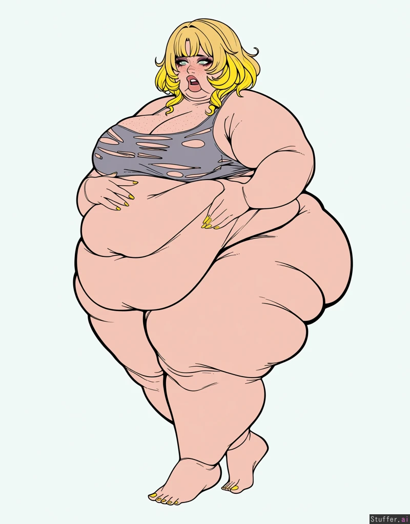 solo, usa3710692(artist), KAMII MOMORU(artist), kobayasikobako(artist), thick lines, High quality, (Masterpiece), (semi-realistic human anatomy), (perfect anatomy), (perfect hands), (flat colors:1.3), 1girl, aglaea, honkai star rail, blonde, ((Beautiful adult female)), (dense freckles), (detailed eyes, detailed face), Original clothes, barefoot, (soft lips, pink lips), hand on breasts, hand on waist, yellow nails, ((embarrased)),(huge hips, huge thighs), (fat transformation:1.75), despair, insane, fat, obese, (ripped clothes:1.4), fat feet, ((giant feet 3.0)), unproportion feet, cellulite, fat hands, giant hands, triple chin, open eyes, open mouth, front side full body shot, standing, walking,