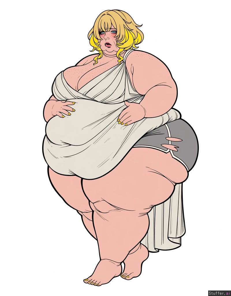 solo, usa3710692(artist), KAMII MOMORU(artist), kobayasikobako(artist), thick lines, High quality, (Masterpiece), (semi-realistic human anatomy), (perfect anatomy), (perfect hands), (flat colors:1.3), 1girl, aglaea, honkai star rail, blonde, ((Beautiful adult female)), (dense freckles), (detailed eyes, detailed face), Original clothes, gray sport shorts,white greek dress, barefoot, (soft lips, pink lips), hand on breasts, hand on waist, yellow nails, ((embarrased)),(huge hips, huge thighs), (fat transformation:1.75), despair, insane, fat, obese, (ripped clothes:1.4), fat feet, ((giant feet 3.0)), unproportion feet, cellulite, fat hands, giant hands, triple chin, open eyes, open mouth, front side full body shot, standing, walking,