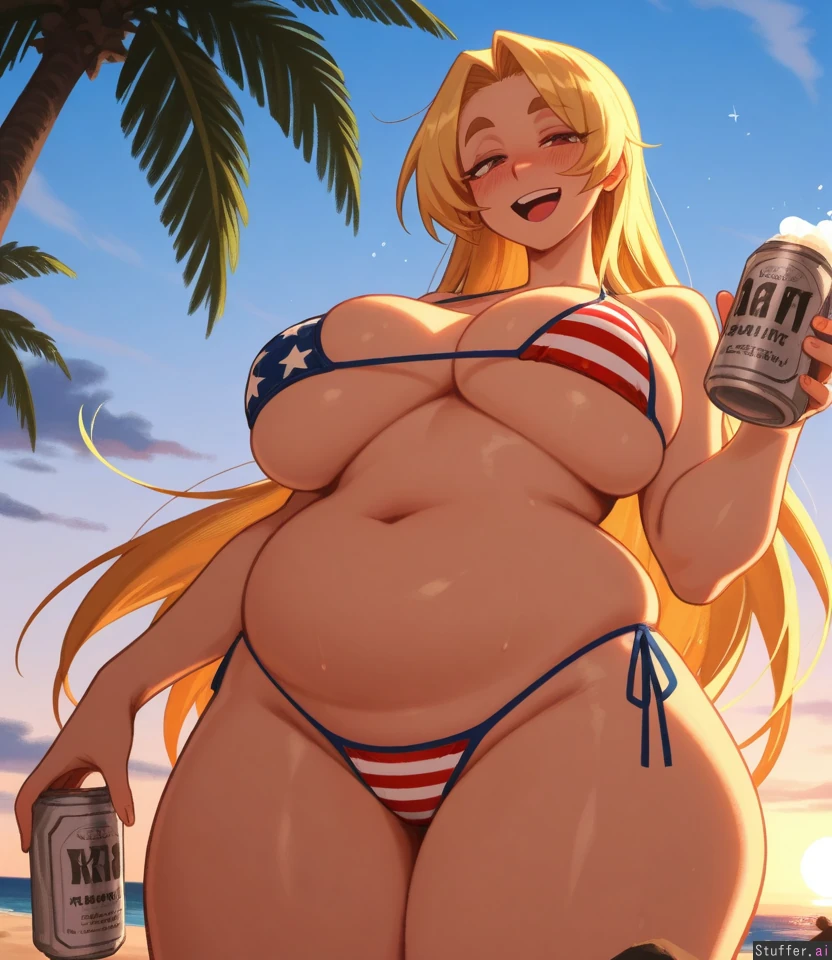 absurd res, 8k, perfect anatomy, masterpiece, beautiful face , beautiful eyes, khyle. , Noodlenood, (usa37107692:1),mdf_an , (vanripper:1), betterwithsalt , 1girl, solo, (tall female:1.3), blonde_hair , brown_eyes, american_flag_bikini, thick_eyebrows, baseball_cap, holding beer_can, other hand holding_ belly, drunk, low-angle_view , beach, weight gain,