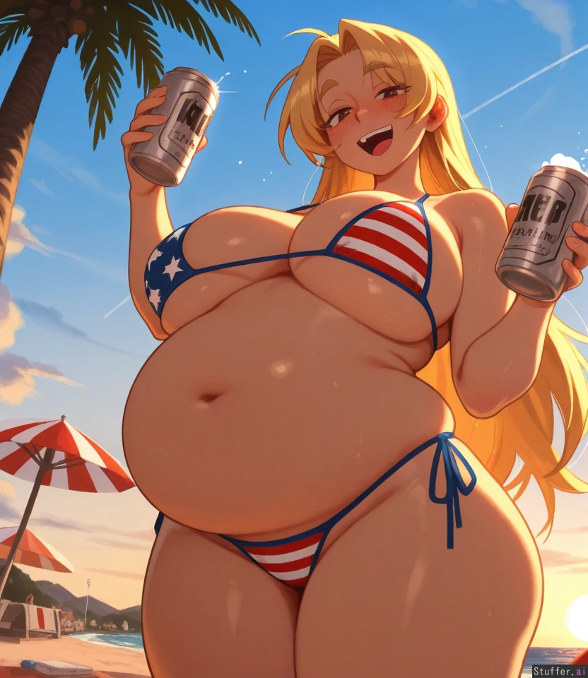 absurd res, 8k, perfect anatomy, masterpiece, beautiful face , beautiful eyes, khyle. , Noodlenood, (usa37107692:1),mdf_an , (vanripper:1), betterwithsalt , 1girl, solo, (tall female:1.3), blonde_hair , brown_eyes, american_flag_bikini, thick_eyebrows, baseball_cap, holding beer_can, other hand holding her belly, drunk, low-angle_view , beach, weight gain,