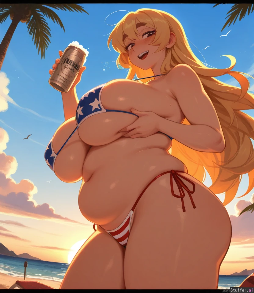 absurd res, 8k, perfect anatomy, masterpiece, beautiful face , beautiful eyes, khyle. , Noodlenood, (usa37107692:1),mdf_an , (vanripper:1), betterwithsalt , 1girl, solo, (tall female:1.3), blonde_hair , brown_eyes, american_flag_bikini, thick_eyebrows, baseball_cap, holding beer_can, drunk, low-angle_view , side-view, beach, weight gain, fat ass, grabbing_own_breast