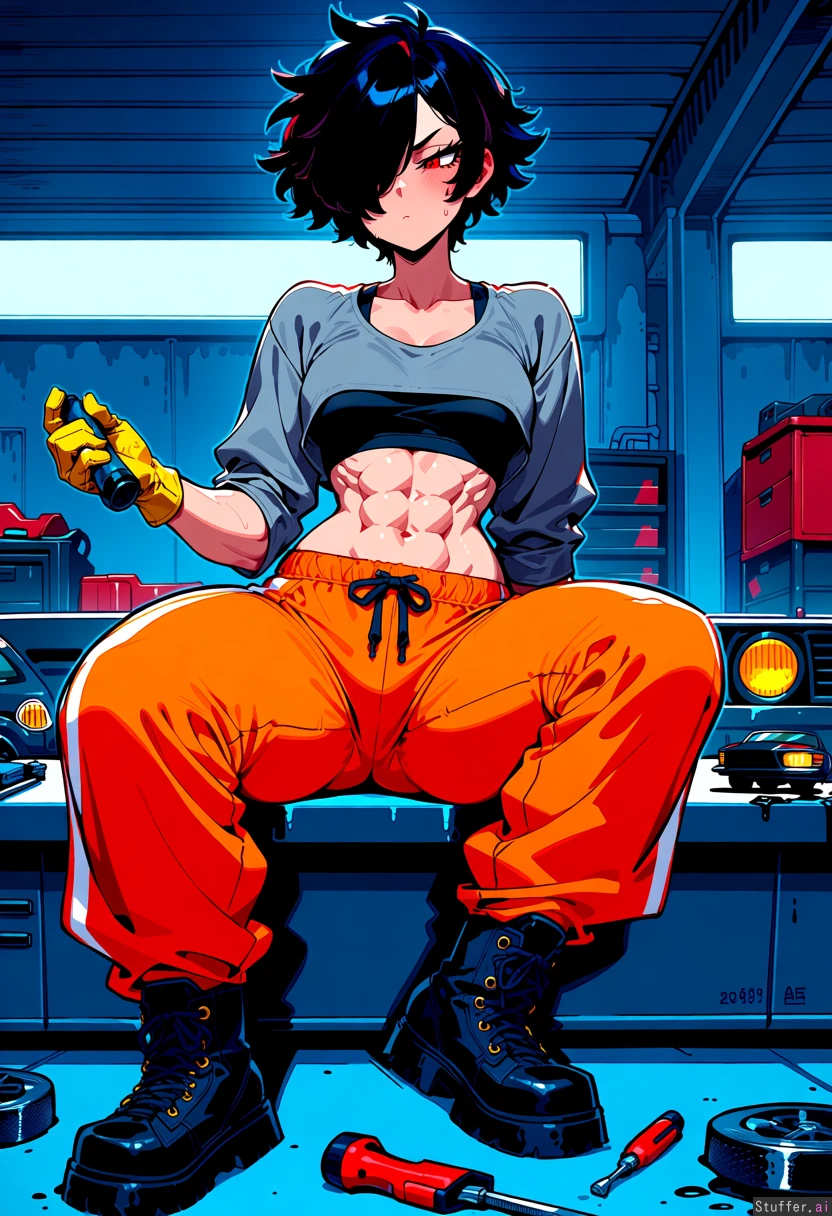1girl, tomboy, tall girl, athletic female, toned body, light skin, short messy black hair, jet black hair, bangs covering one eye, red eyes, ruby eyes, sharp gaze, slight blush, small breasts, wide hips, thick thighs, defined abs, mechanic girl, confident expression, looking away crop top, grey crop top, black sports bra visible, track pants, orange pants, loose pants, combat boots, black boots garage, car workshop, tools, greasy hands, oil stains, industrial background. Toyota AE86, pop-up headlights, project car, missing parts, car repair, mechanical details