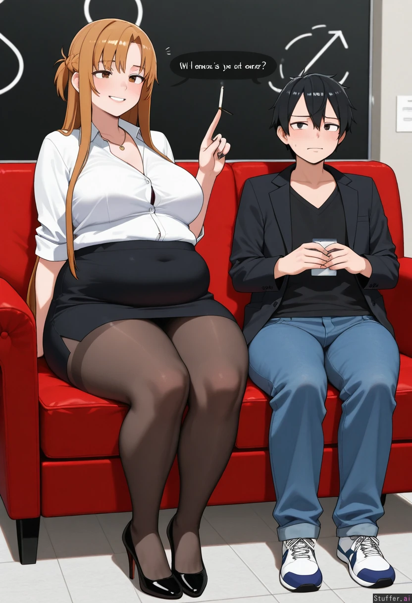 kipteitei, ohasi_art, spellsx, betterwithsalt, ((very detailed)) 1girl, businesswoman, asuna_(sao), long hair, brown hair, brown eyes, mature_female, evil. She is wearing black mini pencil skirt, black stockings, black suit jacket, white buttoned shirt, black heels, long black fingernails, black lips, dark eyeshadow, necklace. she is curvy, voluptuous, overweight, obese, with thick thighs, chubby fingers, fat_arms, fat waist, muffin_top, medium breasts, round face, fat face, double chin and a big round fat belly. She is bored, arrogant, vain, mean, smirking. 1boy, kirito from sao, black hair. He is wearing jeans and black t shirt. He is confused. He is skinny and fit. At the office, girl is sitting alone at an exquisite red sofa, boy is sitting alone at a small chair, facing each over, girl is laughing at boy, girl is holding a cigarette, girl is pointing mockingly at boy, boy is sitting in front of girl Clearly separated genders with no mixing of features between male and female(2.0): male traits are strictly limited to the male only, female traits are strictly limited to the female only, pure gender separation, no crossover traits, no feature bleed, no male features on female, no female features on male, no blending of bodies or faces.