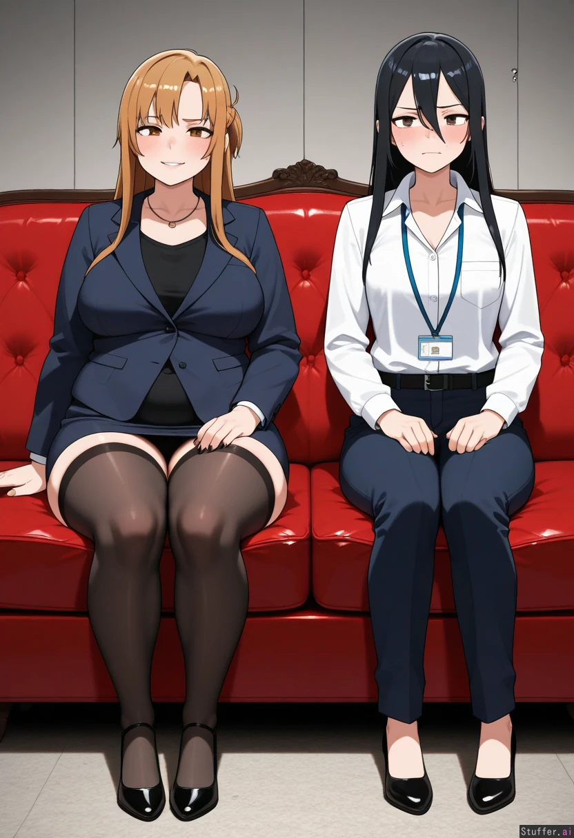 kipteitei, ohasi_art, spellsx, betterwithsalt, ((very detailed)) 1girl, businesswoman, asuna_(sao), long hair, brown hair, brown eyes, mature_female, evil. She is wearing black mini pencil skirt, black stockings, black suit jacket, white buttoned shirt, black heels, long black fingernails, black lips, dark eyeshadow, necklace. she is curvy, voluptuous, overweight, obese, with thick thighs, chubby fingers, fat_arms, fat waist, muffin_top, medium breasts, round face, fat face, double chin and a big round fat belly. She is bored, arrogant, vain, mean, annoyed, pissed off. 1boy, kirito from sao, black hair. He is wearing jeans and black t shirt. He is confused. He is skinny and fit. At the office, girl is sitting alone at an exquisite red sofa, boy is sitting alone at a small chair, facing each over, girl is laughing at boy, girl is holding a cigarette, girl is pointing mockingly at boy, boy is sitting in front of girl Clearly separated genders with no mixing of features between male and female(2.0): male traits are strictly limited to the male only, female traits are strictly limited to the female only, pure gender separation, no crossover traits, no feature bleed, no male features on female, no female features on male, no blending of bodies or faces.