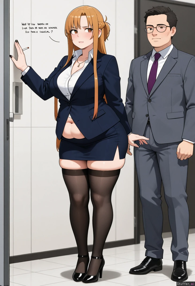 kipteitei, ohasi_art, spellsx, betterwithsalt, ((very detailed)) 1girl, businesswoman, asuna_(sao), long hair, brown hair, brown eyes, mature_female, evil. She is wearing black mini pencil skirt, black stockings, black suit jacket, white buttoned shirt, black heels, long black fingernails, black lips, dark eyeshadow, necklace. she is curvy, voluptuous, overweight, obese, with thick thighs, chubby fingers, fat_arms, fat waist, muffin_top, medium breasts, round face, fat face, double chin and a big round fat belly. She is bored, arrogant, vain, mean, annoyed, pissed off. 1boy, evil businessman with brown hair. He is wearing gray suit with a purple tie and glasses. He is confused At the office, girl is smoking a cigarette, boy stands behind girl, doggy style Clearly separated genders with no mixing of features between male and female(2.0): male traits are strictly limited to the male only, female traits are strictly limited to the female only, pure gender separation, no crossover traits, no feature bleed, no male features on female, no female features on male, no blending of bodies or faces.