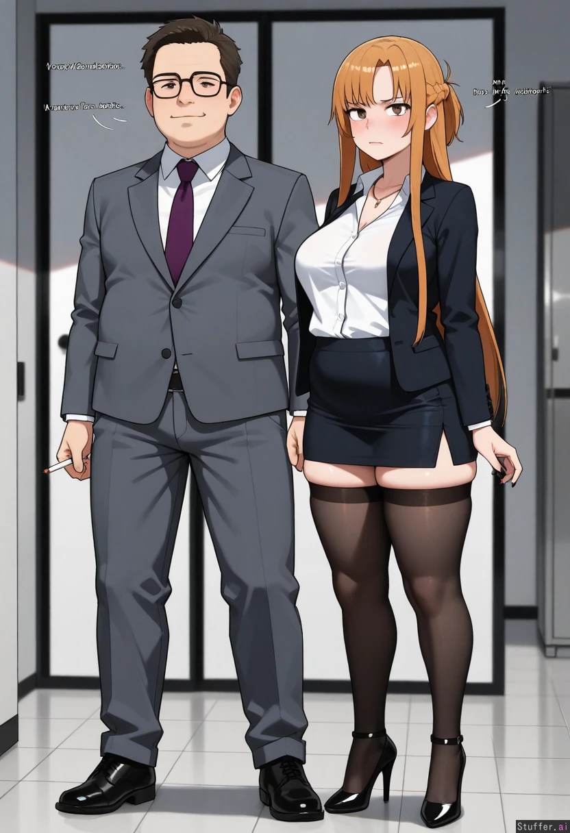 kipteitei, ohasi_art, spellsx, betterwithsalt, ((very detailed)) 1girl, businesswoman, asuna_(sao), long hair, brown hair, brown eyes, mature_female, evil. She is wearing black mini pencil skirt, black stockings, black suit jacket, white buttoned shirt, black heels, long black fingernails, black lips, dark eyeshadow, necklace. she is curvy, voluptuous, overweight, obese, with thick thighs, chubby fingers, fat_arms, fat waist, muffin_top, medium breasts, round face, fat face, double chin and a big round fat belly. She is bored, arrogant, vain, mean, annoyed, pissed off. 1boy, evil businessman with brown hair. He is wearing gray suit with a purple tie and glasses. He is confused At the office, girl is smoking a cigarette, boy stands behind girl, doggy style Clearly separated genders with no mixing of features between male and female(2.0): male traits are strictly limited to the male only, female traits are strictly limited to the female only, pure gender separation, no crossover traits, no feature bleed, no male features on female, no female features on male, no blending of bodies or faces.