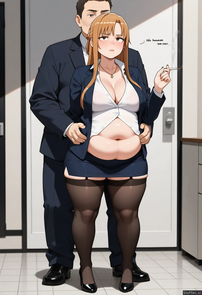 kipteitei, ohasi_art, spellsx, betterwithsalt, ((very detailed)) 1girl, businesswoman, asuna_(sao), long hair, brown hair, brown eyes, mature_female, evil. She is wearing black mini pencil skirt, black stockings, black suit jacket, white buttoned shirt, black heels, long black fingernails, black lips, dark eyeshadow, necklace. she is curvy, voluptuous, overweight, obese, with thick thighs, chubby fingers, fat_arms, fat waist, muffin_top, medium breasts, round face, fat face, double chin and a big round fat belly. She is bored, arrogant, vain, mean, annoyed, pissed off. At the office, girl is smoking a cigarette, boy stands behind girl, doggy style