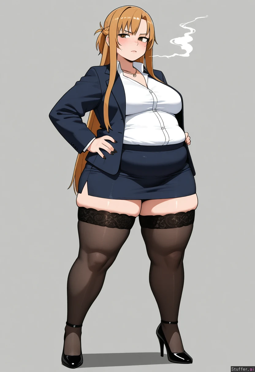 kipteitei, ohasi_art, spellsx, betterwithsalt, ((very detailed)) 1girl, businesswoman, asuna_(sao), long hair, brown hair, brown eyes, mature_female, evil. She is wearing black mini pencil skirt, black stockings, black suit jacket, white buttoned shirt, black heels, long black fingernails, black lips, dark eyeshadow, necklace. she is curvy, voluptuous, overweight, obese, with thick thighs, chubby fingers, fat_arms, fat waist, muffin_top, medium breasts, round face, fat face, double chin and a big round fat belly. She is bored, arrogant, vain, mean, annoyed, pissed off. At the office, girl is smoking a cigarette, doggy style