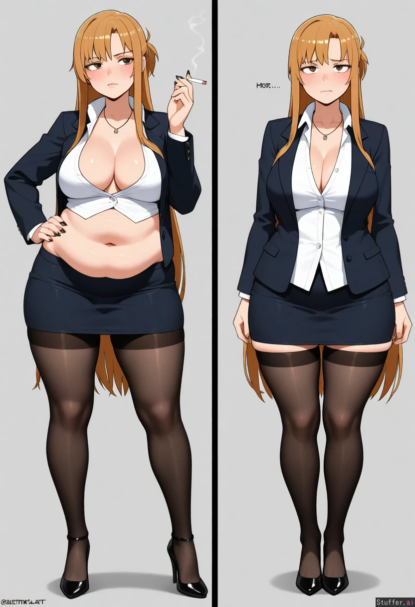 kipteitei, ohasi_art, spellsx, betterwithsalt, ((very detailed)) 1girl, businesswoman, asuna_(sao), long hair, brown hair, brown eyes, mature_female, evil. She is wearing black mini pencil skirt, black stockings, black suit jacket, white buttoned shirt, black heels, long black fingernails, black lips, dark eyeshadow, necklace. she is curvy, voluptuous, overweight, obese, with thick thighs, chubby fingers, fat_arms, fat waist, muffin_top, medium breasts, round face, fat face, double chin and a big round fat belly. She is bored, arrogant, vain, mean, annoyed, pissed off. At the office, girl is smoking a cigarette, doggy style
